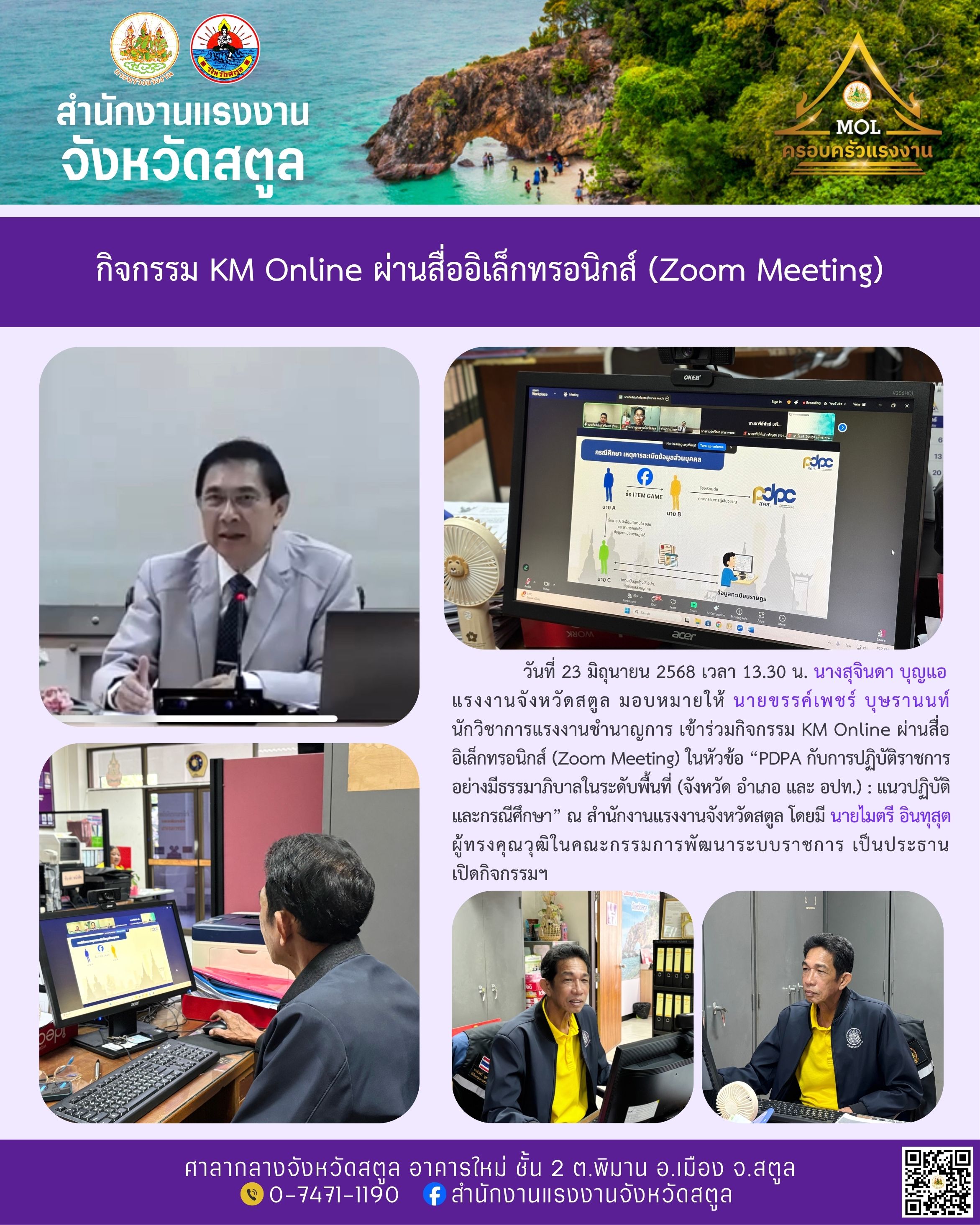 วันที่ 23 มิถุนายน 2568 เวลา 13.30 น. นางสุจินดา บุญแอ แรงงานจังหวัดสตูล มอบหมายให้ นายขรรค์เพชร์ บุษรานนท์ นักวิชาการแรงงานชำนาญการ เข้าร่วมกิจกรรม KM Online ผ่านสื่ออิเล็กทรอนิกส์ (Zoom Meeting) ในหัวข้อ “PDPA กับการปฏิบัติราชการอย่างมีธรรมาภิบาลในระดับพื้นที่ (จังหวัด อำเภอ และ อปท.) : แนวปฏิบัติ และกรณีศึกษา” ณ สำนักงานแรงงานจังหวัดสตูล โดยมี นายไมตรี อินทุสุต ผู้ทรงคุณวุฒิในคณะกรรมการพัฒนาระบบราชการ เป็นประธานเปิดกิจกรรมฯ