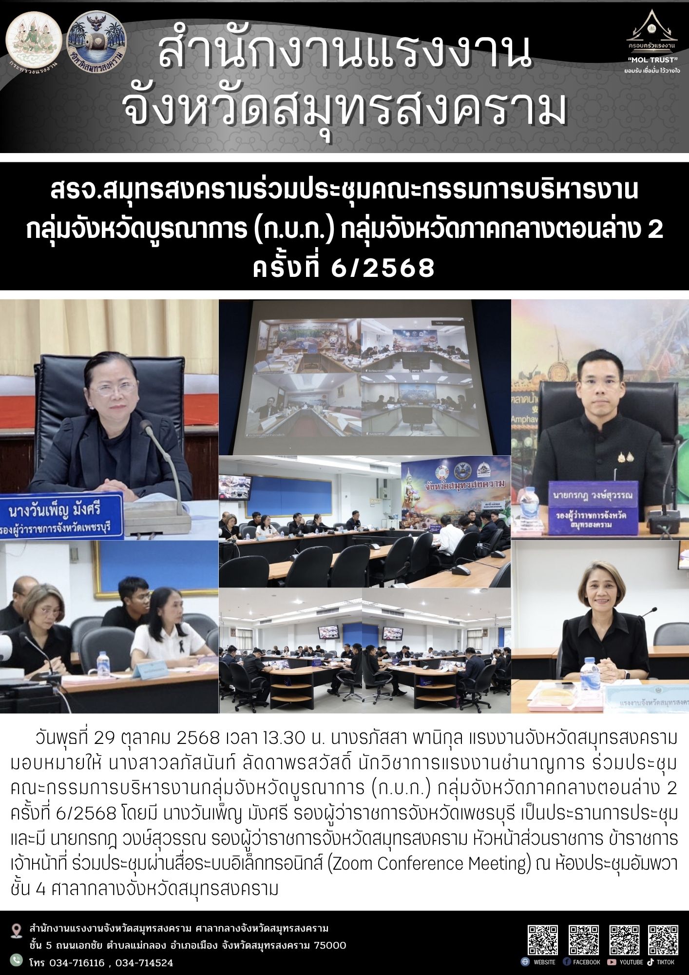 วันพุธที่ 29 ตุลาคม 2568 เวลา 13.30 น. นางรภัสสา พานิกุล แรงงานจังหวัดสมุทรสงคราม มอบหมายให้ นางสาวลภัสนันท์ ลัดดาพรสวัสดิ์ นักวิชาการแรงงานชำนาญการ ร่วมประชุมคณะกรรมการบริหารงานกลุ่มจังหวัดบูรณาการ (ก.บ.ก.) กลุ่มจังหวัดภาคกลางตอนล่าง 2 ครั้งที่ 6/2568 โดยมี นางวันเพ็ญ มังศรี รองผู้ว่าราชการจังหวัดเพชรบุรี เป็นประธานการประชุม และมี นายกรกฎ วงษ์สุวรรณ รองผู้ว่าราชการจังหวัดสมุทรสงคราม หัวหน้าส่วนราชการ ข้าราชการ เจ้าหน้าที่ ร่วมประชุมผ่านสื่อระบบอิเล็กทรอนิกส์ (Zoom Conference Meeting) ณ ห้องประชุมอัมพวา ชั้น 4 ศาลากลางจังหวัดสมุทรสงคราม