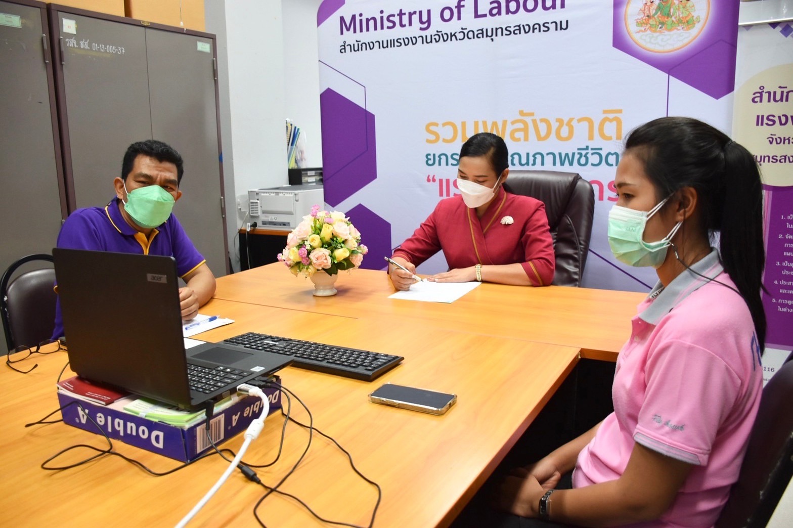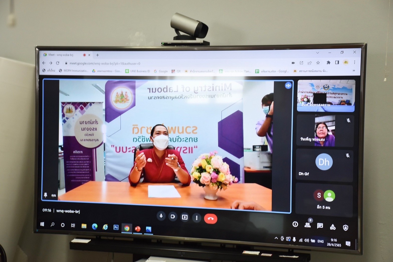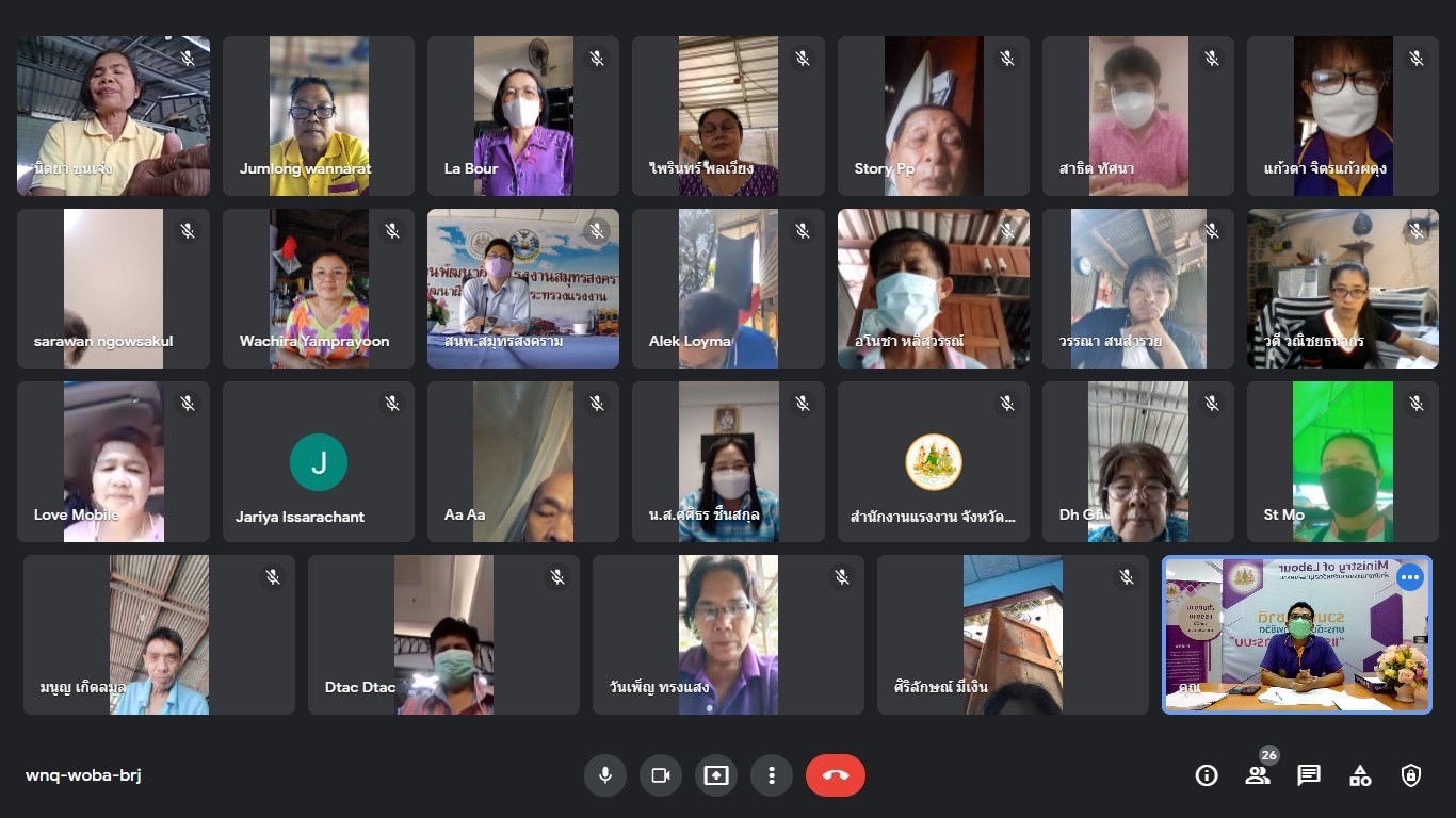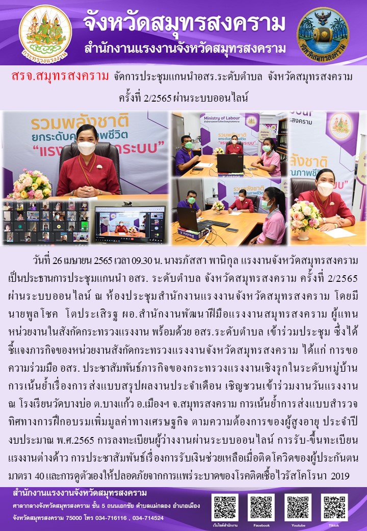 วันที่ 26 เมษายน 2565 เวลา 09.30 น. นางรภัสสา พานิกุล แรงงานจังหวัดสมุทรสงคราม เป็นประธานการประชุมแกนนำ อสร. ระดับตำบล จังหวัดสมุทรสงคราม ครั้งที่ 2/2565 ผ่านระบบออนไลน์ ณ ห้องประชุมสำนักงานแรงงานจังหวัดสมุทรสงคราม โดยมี นายพูลโชค โตประเสิรฐ ผอ.สำนักงานพัฒนาฝีมือแรงงานสมุทรสงคราม ผู้แทนหน่วยงานในสังกัดกระทรวงแรงงาน พร้อมด้วย อสร.ระดับตำบล เข้าร่วมประชุม ซึ่งได้ชี้แจงภารกิจของหน่วยงานสังกัดกระทรวงแรงงานจังหวัดสมุทรสงคราม ได้แก่ การขอความร่วมมือ อสร. ประชาสัมพันธ์ภารกิจของกระทรวงแรงงานเชิงรุกในระดับหมู่บ้าน การเน้นย้ำเรื่องการส่งแบบสรุปผลงานประจำเดือน เชิญชวนเข้าร่วมงานวันแรงงาน ณ โรงเรียนวัดบางบ่อ ต.บางแก้ว อ.เมืองฯ จ.สมุทรสงคราม การเน้นย้ำการส่งแบบสำรวจทิศทางการฝึกอบรมเพิ่มมูลค่าทางเศรษฐกิจ ตามความต้องการของผู้สูงอายุ ประจำปีงบประมาณ พ.ศ.2565 การลงทะเบียนผู้ว่างงานผ่านระบบออนไลน์ การรับ-ขึ้นทะเบียนแรงงานต่างด้าว การประชาสัมพันธ์เรื่องการรับเงินช่วยเหลือเมื่อติดโควิดของผู้ประกันตน มาตรา 40 และการดูตัวเองให้ปลอดภัยจากการแพร่ระบาดของโรคติดเชื้อไวรัสโคโรนา 2019