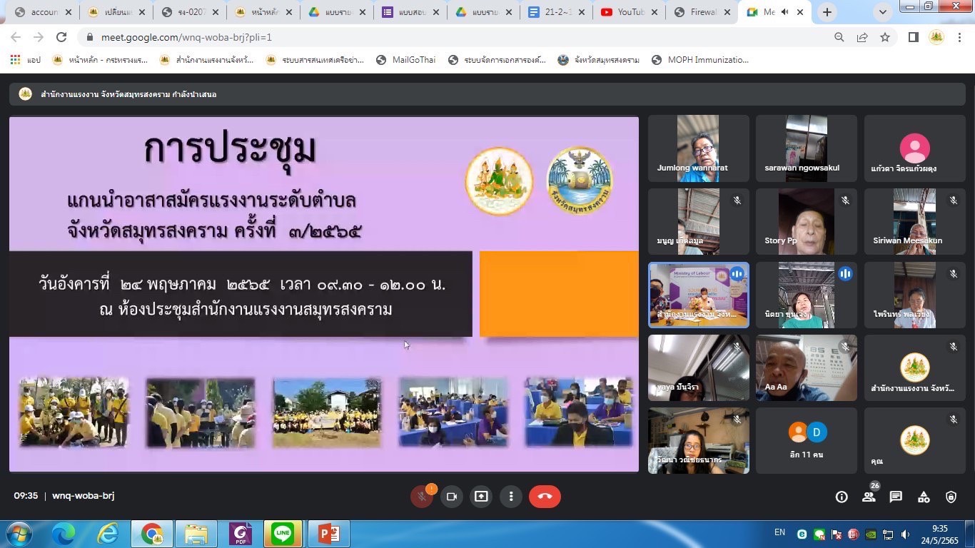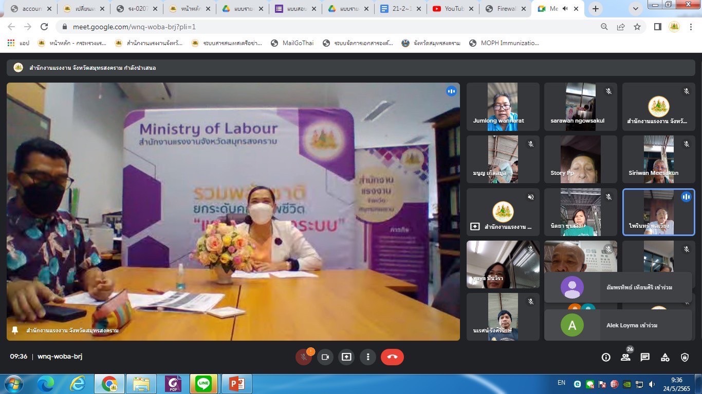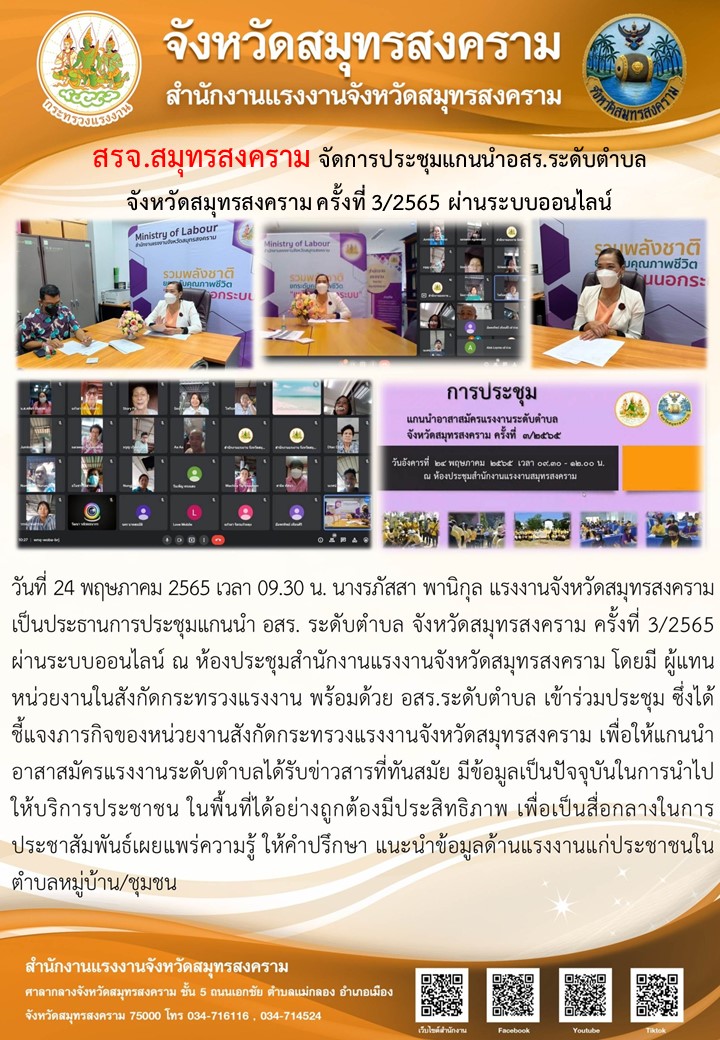 วันที่ 24 พฤษภาคม 2565 เวลา 09.30 น. นางรภัสสา พานิกุล แรงงานจังหวัดสมุทรสงคราม เป็นประธานการประชุมแกนนำ อสร. ระดับตำบล จังหวัดสมุทรสงคราม ครั้งที่ 3/2565 ผ่านระบบออนไลน์ ณ ห้องประชุมสำนักงานแรงงานจังหวัดสมุทรสงคราม โดยมี ผู้แทนหน่วยงานในสังกัดกระทรวงแรงงาน พร้อมด้วย อสร. ระดับตำบล เข้าร่วมประชุม ซึ่งได้ชี้แจงภารกิจของหน่วยงานสังกัดกระทรวงแรงงานจังหวัดสมุทรสงคราม เพื่อให้แกนนำอาสาสมัครแรงงานระดับตำบลได้รับข่าวสารที่ทันสมัย มีข้อมูลเป็นปัจจุบันในการนำไปให้บริการประชาชนในพื้นที่ได้อย่างถูกต้องมีประสิทธิภาพ เพื่อเป็นสื่อกลางในการประชาสัมพันธ์เผยแพร่ความรู้ ให้คำปรึกษา แนะนำข้อมูลด้านแรงงานแก่ประชาชนในตำบล หมู่บ้าน และ ชุมชน