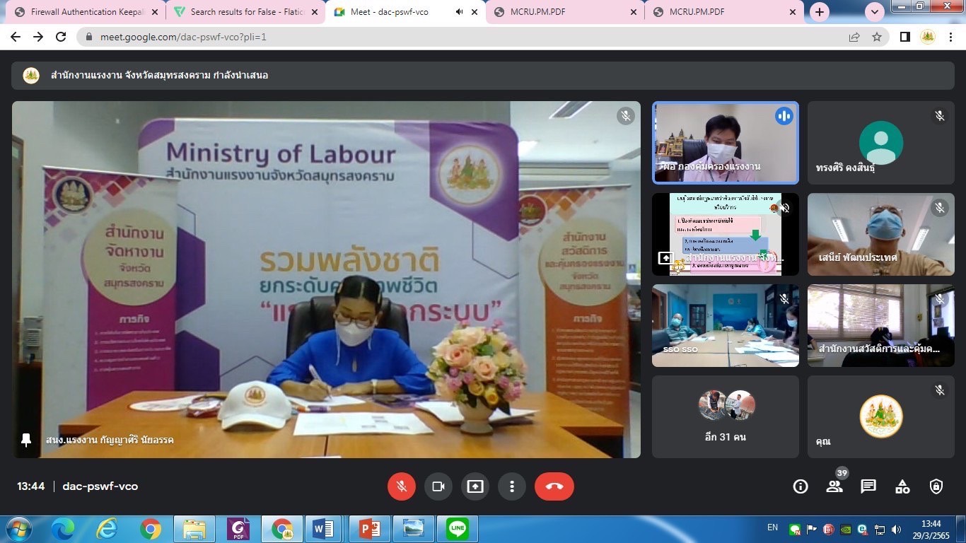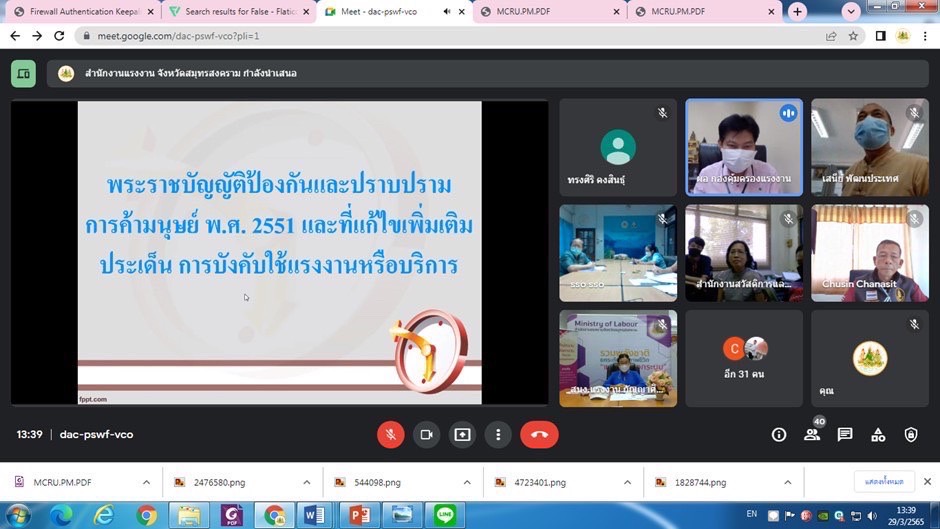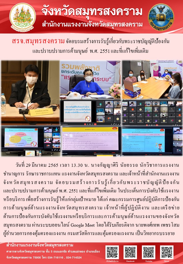 วันที่ 29 มีนาคม 2565 เวลา 13.30 น. นางกัญญาศิริ นัยอรรถ นักวิชาการแรงงานชำนาญการ รักษาราชการแทน แรงงานจังหวัดสมุทรสงคราม และเจ้าหน้าที่สำนักงานแรงงานจังหวัดสมุทรสงคราม จัดอบรมสร้างการรับรู้เกี่ยวกับพระราชบัญญัติป้องกันและปราบปรามการค้ามนุษย์ พ.ศ. 2551 และที่แก้ไขเพิ่มเติม ในประเด็นการบังคับใช้แรงงานหรือบริการ เพื่อสร้างการรับรู้ให้แก่กลุ่มเป้าหมาย ได้แก่ คณะกรรมการศูนย์ปฏิบัติการป้องกันการค้ามนุษย์ด้านแรงงานจังหวัดสมุทรสงคราม เจ้าหน้าที่ผู้ปฏิบัติงาน และเครือข่ายด้านการป้องกันการบังคับใช้แรงงานหรือบริการและการค้ามนุษย์ด้านแรงงานของจังหวัดสมุทรสงคราม ผ่านระบบออนไลน์ Google Meet โดยได้รับเกียรติจาก นายพงศ์เทพ เพชรโสม ผู้อำนวยการกองคุ้มครองแรงงาน กรมสวัสดิการและคุ้มครองแรงงาน เป็นวิทยากรบรรยาย