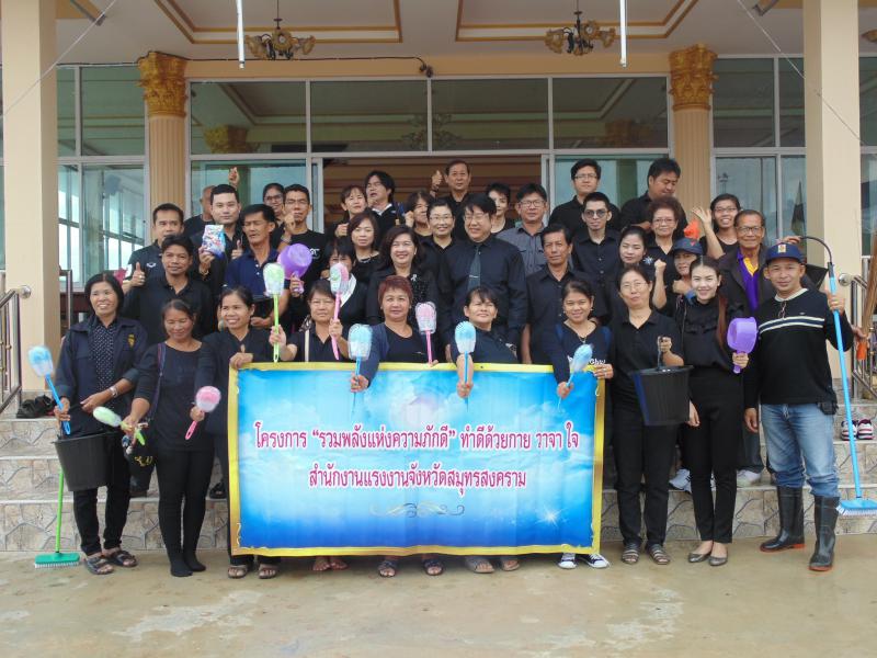 วันนี้ (๑๑ มกราคม ๒๕๖๐) เวลา ๙.๐๐ น. สรจ.สมุทรสงคราม จัดโครงการรวมพลังแห่งความภักดีโดยอาสาสมัครแรงงาน ประจำปีงบประมาณ พ.ศ.๒๕๖๐ (ทำดีด้วยกาย วาจา ใจ) โดยมีนายถนอมศักดิ์ เตชะนิยม ประกันสังคมจังหวัดสมุทรสงคราม เป็นประธาน พร้อมด้วยหัวหน้าหน่วยงานในสังกัดกระทรวงแรงงาน นำเจ้าหน้าที่สำนักงานฯ เข้าร่วมกิจกรรมโดยพร้อมเพรียงกัน ณ วัดธรรมประสิทธิ์ บ้านคลองช่อง หมู่ที่ ๕ ต.คลองโคน อ.เมือง จ.สมุทรสงคราม มีกิจกรรมสวดมนต์เจริญพระพุทธมนต์ ทำบุญ ถวายสังฆทาน เจริญจิตภาวนา บำเพ็ญ สาธารณประโยชน์ ทำความสะอาดวัด เก็บขยะ กวาดพื้น ล้างห้องน้ำ เพื่อน้อมอุทิศถวายเป็นพระราชกุศลแด่พระบาทสมเด็จพระปรมินทรมหาภูมิพลอดุลยเดช มีผู้เข้าร่วมกิจกรรม ๕๐ คน