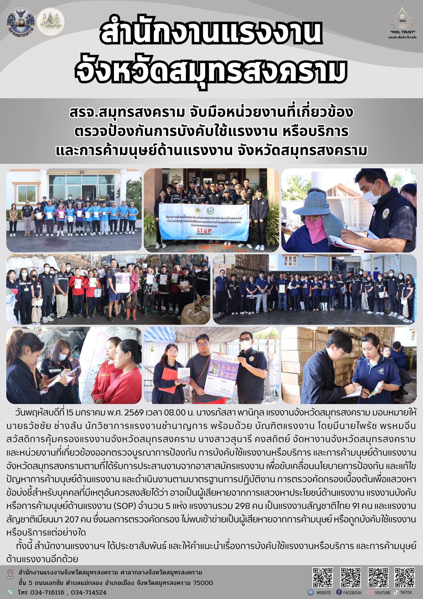 วันพฤหัสบดีที่ 15 มกราคม พ.ศ. 2569 เวลา 08.00 น. นางรภัสสา พานิกุล แรงงานจังหวัดสมุทรสงคราม มอบหมายให้นายธวัชชัย ช่างสัน นักวิชาการแรงงานชำนาญการ พร้อมด้วย บัณฑิตแรงงาน โดยมีนายไพรัช พรหมจีน สวัสดิการคุ้มครองแรงงานจังหวัดสมุทรสงคราม นางสาวสุนารี คงสถิตย์ จัดหางานจังหวัดสมุทรสงคราม และหน่วยงานที่เกี่ยวข้องออกตรวจบูรณาการป้องกัน การบังคับใช้แรงงานหรือบริการ และการค้ามนุษย์ด้านแรงงานจังหวัดสมุทรสงครามตามที่ได้รับการประสานงานจากอาสาสมัครแรงงาน เพื่อขับเคลื่อนนโยบายการป้องกัน และแก้ไขปัญหาการค้ามนุษย์ด้านแรงงาน และดำเนินงานตามมาตรฐานการปฏิบัติงาน การตรวจคัดกรองเบื้องต้นเพื่อแสวงหาข้อบ่งชี้สำหรับบุคคลที่มีเหตุอันควรสงสัยได้ว่า อาจเป็นผู้เสียหายจากการแสวงหาประโยชน์ด้านแรงงาน แรงงานบังคับ หรือการค้ามนุษย์ด้านแรงงาน (SOP) จำนวน 5 แห่ง แรงงานรวม 298 คน เป็นแรงงานสัญชาติไทย 91 คน และแรงงานสัญชาติเมียนมา 207 คน ซึ่งผลการตรวจคัดกรอง ไม่พบเข้าข่ายเป็นผู้เสียหายจากการค้ามนุษย์ หรือถูกบังคับใช้แรงงาน หรือบริการแต่อย่างใด
