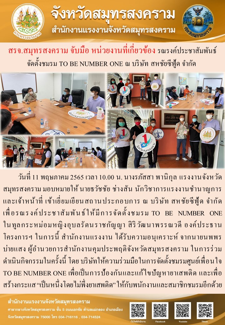 วันที่ 11 พฤษภาคม 2565 เวลา 10.00 น. นางรภัสสา พานิกุล แรงงานจังหวัดสมุทรสงคราม มอบหมายให้ นายธวัชชัย ช่างสัน นักวิชาการแรงงานชำนาญการ และเจ้าหน้าที่ เข้าเยี่ยมเยียนสถานประกอบการ ณ บริษัท สหชัยซีฟู้ด จำกัด เพื่อรณรงค์ประชาสัมพันธ์ให้มีการจัดตั้งชมรม TO BE NUMBER ONE ในทูลกระหม่อมหญิงอุบลรัตนราชกัญญา สิริวัฒนาพรรณวดี องค์ประธานโครงการฯ ในการนี้ สำนักงานแรงงาน ได้รับความอนุเคราะห์ จากนายนพพร บ่ายแสง ผู้อำนวยการสำนักงานคุมประพฤติจังหวัดสมุทรสงคราม ในการร่วมดำเนินกิจกรรมในครั้งนี้ โดย บริษัทให้ความร่วมมือในการจัดตั้งชมรมศูนย์เพื่อนใจ TO BE NUMBER ONE เพื่อเป็นการป้องกันและแก้ไขปัญหายาเสพติด และเพื่อสร้างกระแส “เป็นหนึ่งโดยไม่พึ่งยาเสพติด” ให้กับพนักงานและสมาชิกชมรมอีกด้วย