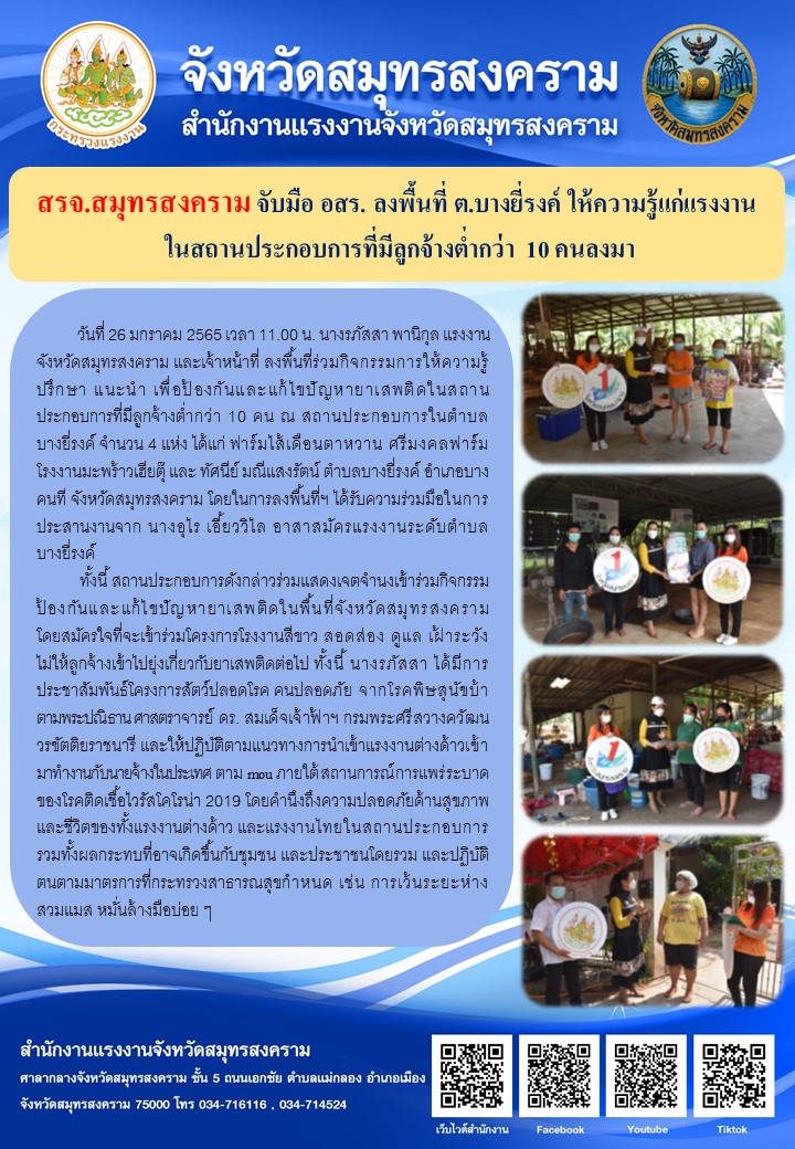 วันที่ 26 มกราคม 2565 เวลา 11.00 น. นางรภัสสา พานิกุล แรงงานจังหวัดสมุทรสงคราม และเจ้าหน้าที่ ลงพื้นที่ร่วมกิจกรรมการให้ความรู้ ปรึกษา แนะนำ เพื่อป้องกันและแก้ไขปัญหายาเสพติดในสถานประกอบการที่มีลูกจ้างต่ำกว่า 10 คน ณ สถานประกอบการในตำบลบางยี่รงค์ จำนวน 4 แห่ง ได้แก่ ฟาร์มไส้เดือนตาหวาน ศรีมงคลฟาร์ม โรงงานมะพร้าวเฮียตุ๊ และ ทัศนีย์ มณีแสงรัตน์ ตำบลบางยี่รงค์ อำเภอบางคนที จังหวัดสมุทรสงคราม โดยในการลงพื้นที่ฯ ได้รับความร่วมมือในการประสานงานจาก นางอุไร เอี้ยววิไล อาสาสมัครแรงงานระดับตำบลบางยี่รงค์