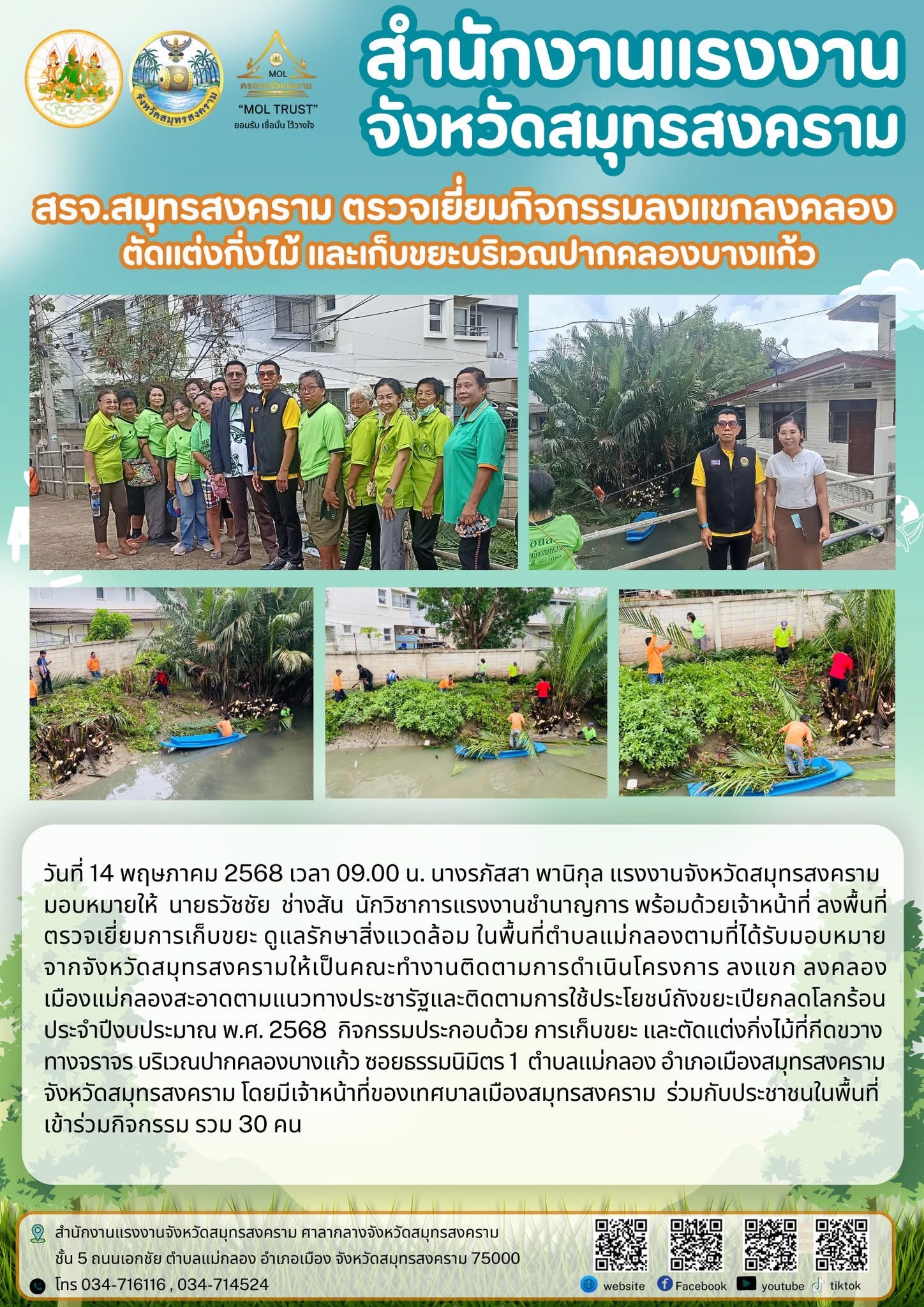 วันที่ 14 พฤษภาคม 2568 เวลา 09.00 น. นางรภัสสา พานิกุล แรงงานจังหวัดสมุทรสงครามมอบหมายให้ นายธวัชชัย ช่างสัน นักวิชาการแรงงานชำนาญการ พร้อมด้วยเจ้าหน้าที่ ลงพื้นที่ตรวจเยี่ยมการเก็บขยะ ดูแลรักษาสิ่งแวดล้อม ในพื้นที่ตำบลแม่กลองตามที่ได้รับมอบหมายจากจังหวัดสมุทรสงครามให้เป็นคณะทำงานติดตามการดำเนินโครงการ ลงแขก ลงคลองเมืองแม่กลองสะอาดตามแนวทางประชารัฐและติดตามการใช้ประโยชน์ถังขยะเปียกลดโลกร้อนประจำปีงบประมาณ พ.ศ. 2568 กิจกรรมประกอบด้วย การเก็บขยะ และตัดแต่งกิ่งไม้ที่กีดขวางทางจราจร บริเวณปากคลองบางแก้ว ซอยธรรมนิมิตร 1 ตำบลแม่กลอง อำเภอเมืองสมุทรสงคราม จังหวัดสมุทรสงคราม โดยมีเจ้าหน้าที่ของเทศบาลเมืองสมุทรสงคราม ร่วมกับประชาชนในพื้นที่เข้าร่วมกิจกรรม รวม 30 คน