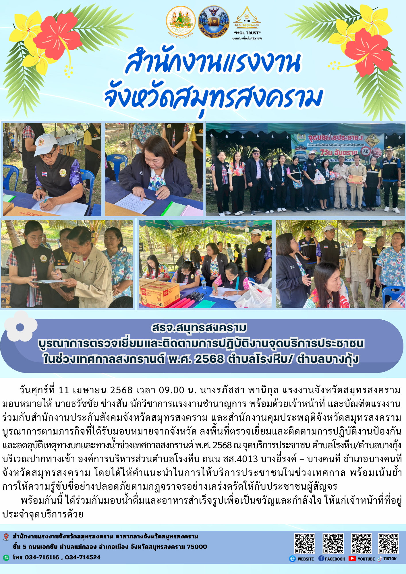 วันศุกร์ที่ 11 เมษายน 2568 เวลา 09.00 น. นางรภัสสา พานิกุล แรงงานจังหวัดสมุทรสงคราม มอบหมายให้ นายธวัชชัย ช่างสัน นักวิชาการแรงงานชำนาญการ พร้อมด้วยเจ้าหน้าที่ และบัณฑิตแรงงาน ร่วมกับสำนักงานประกันสังคมจังหวัดสมุทรสงคราม และสำนักงานคุมประพฤติจังหวัดสมุทรสงคราม บูรณาการตามภารกิจที่ได้รับมอบหมายจากจังหวัด ลงพื้นที่ตรวจเยี่ยมและติดตามการปฏิบัติงานป้องกันและลดอุบัติเหตุทางบกและทางน้ำช่วงเทศกาลสงกรานต์ พ.ศ. 2568 ณ จุดบริการประชาชน ตำบลโรงหีบ/ตำบลบางกุ้ง บริเวณปากทางเข้า องค์การบริหารส่วนตำบลโรงหีบ ถนน สส.4013 บางยี่รงค์ – บางคนที อำเภอบางคนที จังหวัดสมุทรสงคราม โดยได้ให้คำแนะนำในการให้บริการประชาชนในช่วงเทศกาล พร้อมเน้นย้ำการให้ความรู้ขับขี่อย่างปลอดภัยตามกฎจราจรอย่างเคร่งครัดให้กับประชาชนผู้สัญจร
