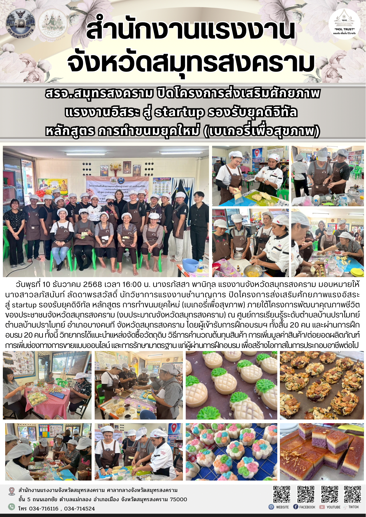 วันพุธที่ 10 ธันวาคม 2568 เวลา 16:00 น. นางรภัสสา พานิกุล แรงงานจังหวัดสมุทรสงคราม มอบหมายให้ นางสาวลภัสนันท์ ลัดดาพรสวัสดิ์ นักวิชาการแรงงานชำนาญการ ปิดโครงการส่งเสริมศักยภาพแรงอิสระ สู่ startup รองรับยุคดิจิทัล หลักสูตร การทำขนมยุคใหม่ (เบเกอรี่เพื่อสุขภาพ) ภายใต้โครงการพัฒนาคุณภาพชีวิตของประชาชนจังหวัดสมุทรสงคราม (งบประมาณจังหวัดสมุทรสงคราม) ณ ศูนย์การเรียนรู้ระดับตำบลบ้านปราโมทย์ ตำบลบ้านปราโมทย์ อำเภอบางคนที จังหวัดสมุทรสงคราม โดยผู้เข้ารับการฝึกอบรมฯ ทั้งสิ้น 20 คน และผ่านการฝึกอบรม 20 คน ทั้งนี้ วิทยากรได้แนะนำแหล่งจัดซื้อวัตถุดิบ วิธีการคำนวณต้นทุนสินค้า การเพิ่มมูลค่าสินค้า/ต่อยอดผลิตภัณฑ์การเพิ่มช่องทางการขายแบบออนไลน์ และการรักษามาตรฐาน แก่ผู้ผ่านการฝึกอบรม เพื่อสร้างโอกาสในการประกอบอาชีพต่อไป