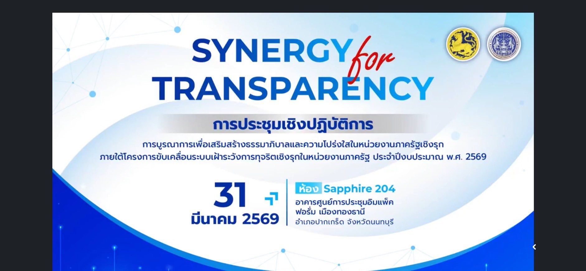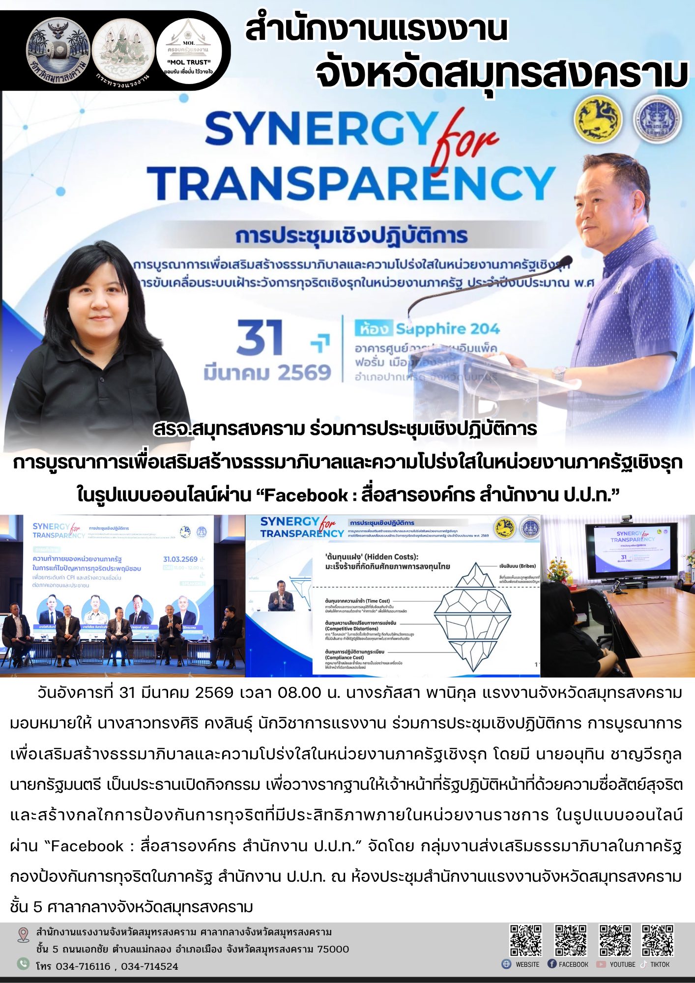 วันอังคารที่ 31 มีนาคม 2569 เวลา 08.00 น. นางรภัสสา พานิกุล แรงงานจังหวัดสมุทรสงคราม มอบหมายให้ นางสาวทรงศิริ คงสินธุ์ นักวิชาการแรงงาน ร่วมการประชุมเชิงปฏิบัติการ การบูรณาการ เพื่อเสริมสร้างธรรมาภิบาลและความโปร่งใสในหน่วยงานภาครัฐเชิงรุก โดยมี นายอนุทิน ชาญวีรกูล นายกรัฐมนตรี เป็นประธานเปิดกิจกรรม เพื่อวางรากฐานให้เจ้าหน้าที่รัฐปฏิบัติหน้าที่ด้วยความซื่อสัตย์สุจริต และสร้างกลไกการป้องกันการทุจริตที่มีประสิทธิภาพภายในหน่วยงานราชการ ในรูปแบบออนไลน์ผ่าน “Facebook : สื่อสารองค์กร สำนักงาน ป.ป.ท.” จัดโดย กลุ่มงานส่งเสริมธรรมาภิบาลในภาครัฐกองป้องกันการทุจริตในภาครัฐ สำนักงาน ป.ป.ท. ณ ห้องประชุมสำนักงานแรงงานจังหวัดสมุทรสงคราม ชั้น 5 ศาลากลางจังหวัดสมุทรสงคราม