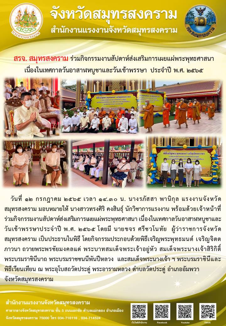 วันที่ 12 กรกฎาคม 2565 เวลา 14.30 น. นางรภัสสา พานิกุล แรงงานจังหวัดสมุทรสงคราม มอบหมายให้ นางสาวทรงศิริ คงสินธุ์ นักวิชาการแรงงาน พร้อมด้วยเจ้าหน้าที่ ร่วมกิจกรรมงานสัปดาห์ส่งเสริมการเผยแผ่พระพุทธศาสนา เนื่องในเทศกาลวันอาสาฬหบูชาและวันเข้าพรรษาประจำปี พ.ศ. 2565 โดยมี นายขจร ศรีชวโนทัย ผู้ว่าราชการจังหวัดสมุทรสงคราม เป็นประธานในพิธี โดยกิจกรรมประกอบด้วยพิธีเจริญพระพุทธมนต์ เจริญจิตตภาวนา ถวายพระพรชัยมงคลแด่ พระบาทสมเด็จพระเจ้าอยู่หัว สมเด็จพระนางเจ้าสิริกิติ์ พระบรมราชินีนาถ พระบรมราชชนนีพันปีหลวง และสมเด็จพระนางเจ้า ฯ พระบรมราชินีและพิธีเวียนเทียน ณ พระอุโบสถวัดประดู่ พระอารามหลวง ตำบลวัดประดู่ อำเภออัมพวา จังหวัดสมุทรสงคราม