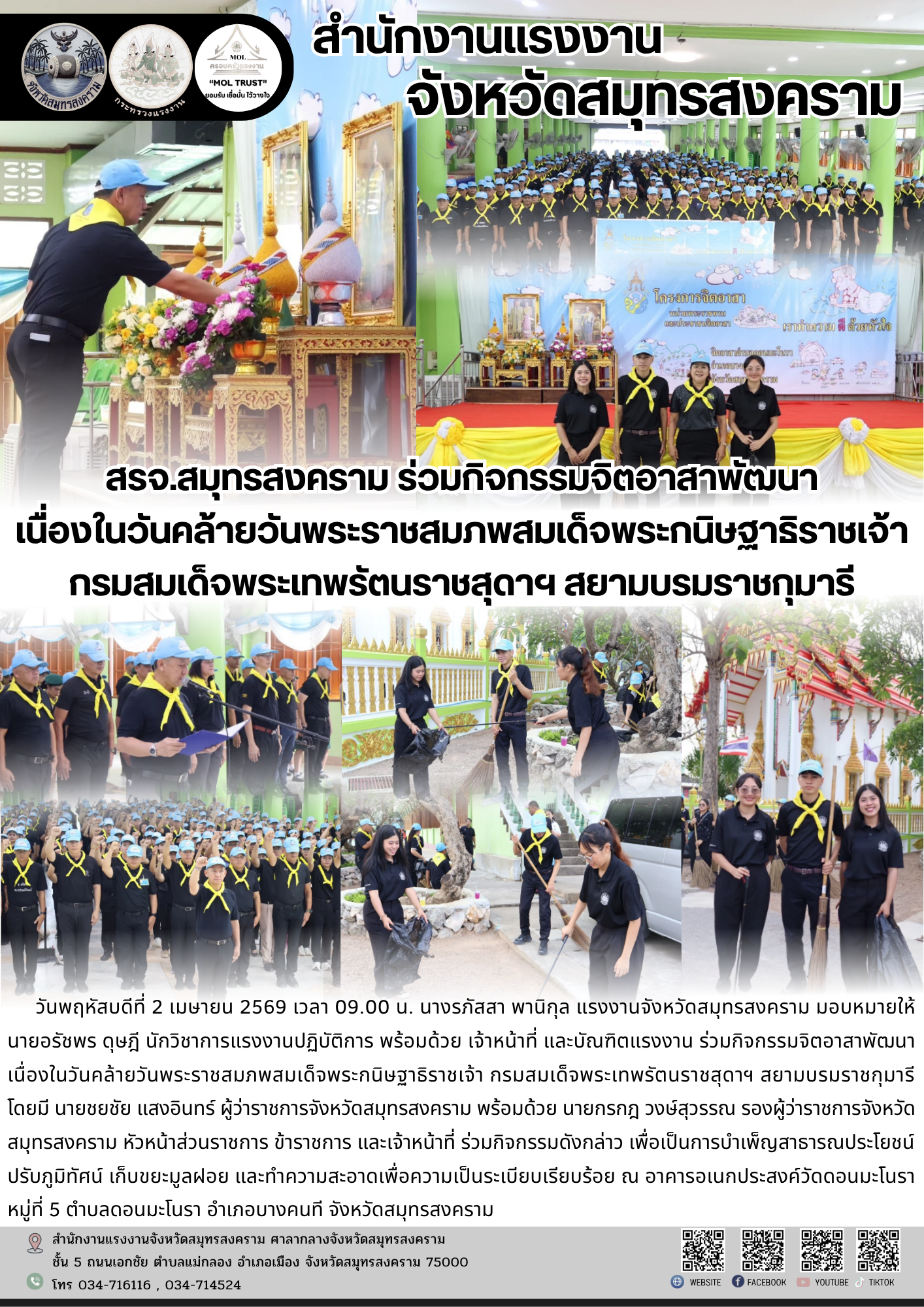วันพฤหัสบดีที่ 2 เมษายน 2569 เวลา 09.00 น. นางรภัสสา พานิกุล แรงงานจังหวัดสมุทรสงคราม มอบหมายให้ นายอรัชพร ดุษฎี นักวิชาการแรงงานปฏิบัติการ พร้อมด้วย เจ้าหน้าที่ และบัณฑิตแรงงาน ร่วมกิจกรรมจิตอาสาพัฒนา เนื่องในวันคล้ายวันพระราชสมภพสมเด็จพระกนิษฐาธิราชเจ้า กรมสมเด็จพระเทพรัตนราชสุดาฯ สยามบรมราชกุมารี โดยมี นายชยชัย แสงอินทร์ ผู้ว่าราชการจังหวัดสมุทรสงคราม พร้อมด้วย นายกรกฎ วงษ์สุวรรณ รองผู้ว่าราชการจังหวัดสมุทรสงคราม หัวหน้าส่วนราชการ ข้าราชการ และเจ้าหน้าที่ ร่วมกิจกรรมดังกล่าว เพื่อเป็นการบำเพ็ญสาธารณประโยชน์ ปรับภูมิทัศน์ เก็บขยะมูลฝอย และทำความสะอาดเพื่อความเป็นระเบียบเรียบร้อย ณ อาคารอเนกประสงค์วัดดอนมะโนรา หมู่ที่ 5 ตำบลดอนมะโนรา อำเภอบางคนที จังหวัดสมุทรสงคราม