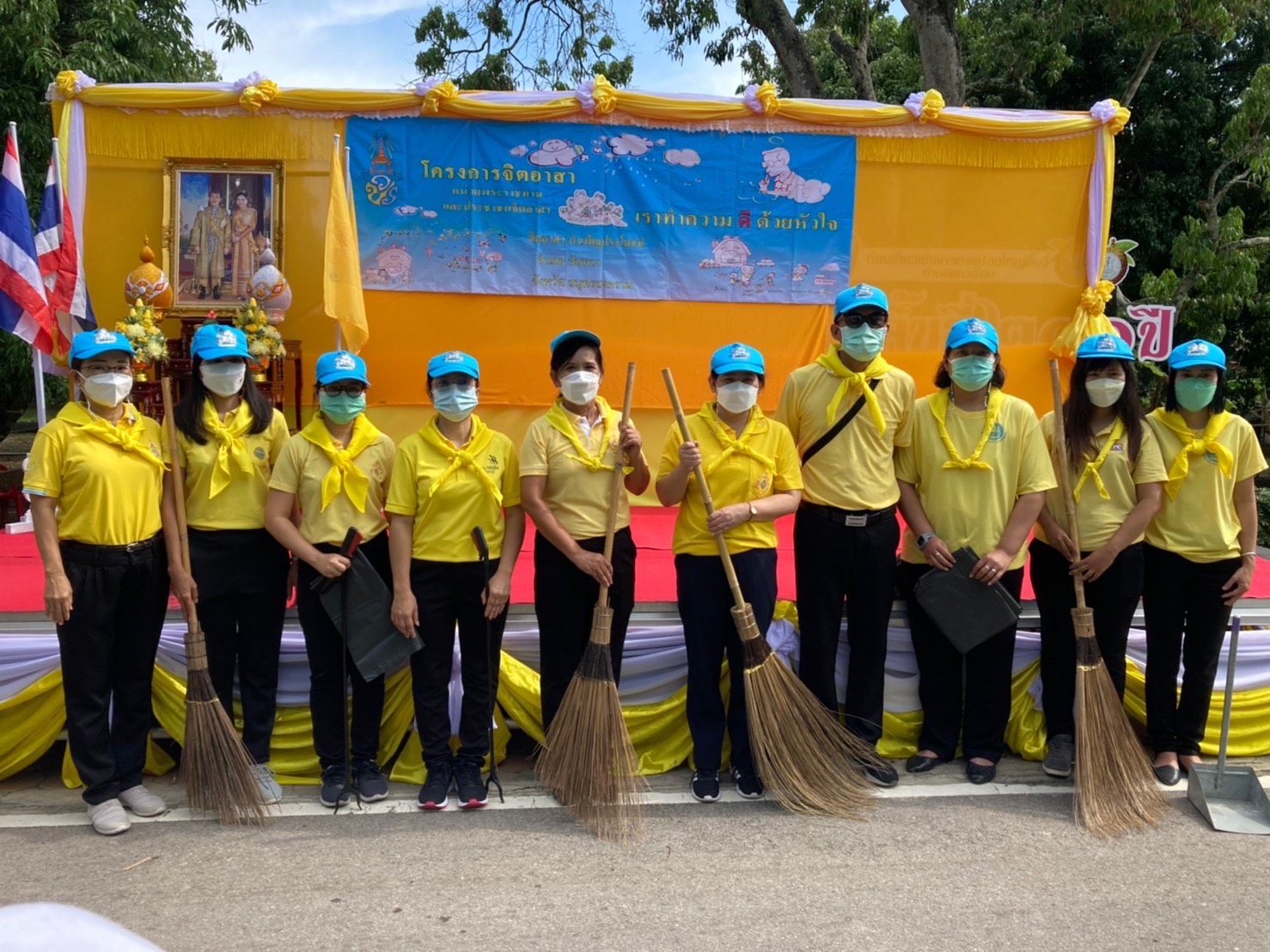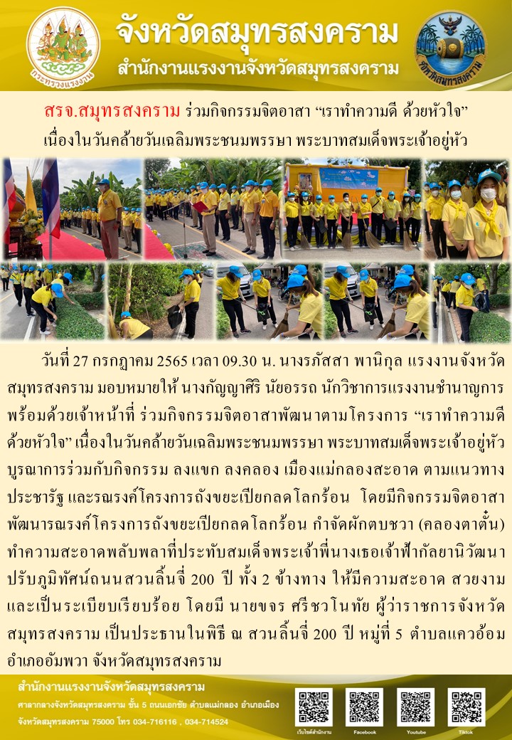 วันที่ 27 กรกฏาคม 2565 เวลา 09.30 น. นางรภัสสา พานิกุล แรงงานจังหวัดสมุทรสงคราม มอบหมายให้ นางกัญญาศิริ นัยอรรถ นักวิชาการแรงงานชำนาญการ พร้อมด้วยเจ้าหน้าที่ ร่วมกิจกรรมจิตอาสาพัฒนาตามโครงการ “เราทำความดี ด้วยหัวใจ” เนื่องในวันคล้ายวันเฉลิมพระชนมพรรษา พระบาทสมเด็จพระเจ้าอยู่หัว บูรณาการร่วมกับกิจกรรม ลงแขก ลงคลอง เมืองแม่กลองสะอาด ตามแนวทางประชารัฐ และรณรงค์โครงการถังขยะเปียกลดโลกร้อน โดยมีกิจกรรมจิตอาสาพัฒนารณรงค์โครงการถังขยะเปียกลดโลกร้อน กำจัดผักตบชวา (คลองตาตั๋น) ทำความสะอาดพลับพลาที่ประทับสมเด็จพระเจ้าพี่นางเธอเจ้าฟ้ากัลยานิวัฒนา ปรับภูมิทัศน์ถนนสวนลิ้นจี่ 200 ปี ทั้ง 2 ข้างทาง ให้มีความสะอาด สวยงาม และเป็นระเบียบเรียบร้อย โดยมี นายขจร ศรีชวโนทัย ผู้ว่าราชการจังหวัดสมุทรสงคราม เป็นประธานในพิธี ณ สวนลิ้นจี่ 200 ปี หมู่ที่ 5 ตำบลแควอ้อม อำเภออัมพวา จังหวัดสมุทรสงคราม