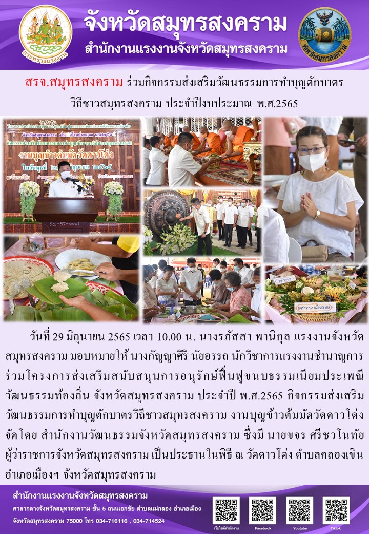 วันที่ 29 มิถุนายน 2565 เวลา 10.00 น. นางรภัสสา พานิกุล แรงงานจังหวัดสมุทรสงคราม มอบหมายให้ นางกัญญาศิริ นัยอรรถ นักวิชาการแรงงานชำนาญการ ร่วมโครงการส่งเสริมสนับสนุนการอนุรักษ์ฟื้นฟูขนบธรรมเนียมประเพณีวัฒนธรรมท้องถิ่น จังหวัดสมุทรสงคราม ประจำปี พ.ศ.2565 กิจกรรมส่งเสริมวัฒนธรรมการทำบุญตักบาตรวิถีชาวสมุทรสงคราม งานบุญข้าวต้มมัดวัดดาวโด่ง จัดโดย สำนักงานวัฒนธรรมจังหวัดสมุทรสงคราม ซึ่งมี นายขจร ศรีชวโนทัย ผู้ว่าราชการจังหวัดสมุทรสงคราม เป็นประธานในพิธี ณ วัดดาวโด่ง ตำบลคลองเขิน อำเภอเมืองฯ จังหวัดสมุทรสงคราม