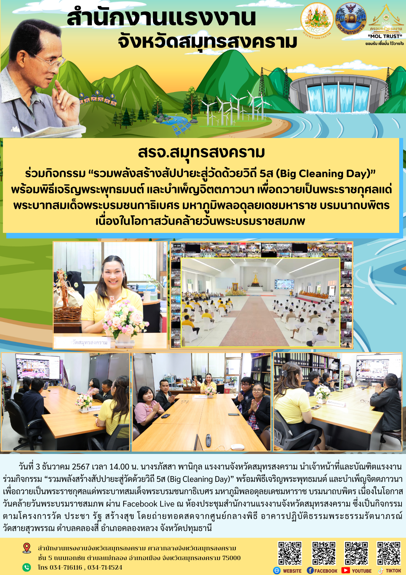 วันที่ 3 ธันวาคม 2567 เวลา 14.00 น. นางรภัสสา พานิกุล แรงงานจังหวัดสมุทรสงคราม นำเจ้าหน้าที่และบัณฑิตแรงงาน ร่วมกิจกรรม “รวมพลังสร้างสัปปายะสู่วัดด้วยวิถี 5ส (Big Cleaning Day)” พร้อมพิธีเจริญพระพุทธมนต์ และบำเพ็ญจิตตภาวนา เพื่อถวายเป็นพระราชกุศลแด่พระบาทสมเด็จพระบรมชนกาธิเบศร มหาภูมิพลอดุลยเดชมหาราช บรมนาถบพิตร เนื่องในโอกาสวันคล้ายวันพระบรมราชสมภพ ผ่าน Facebook Live ณ ห้องประชุมสำนักงานแรงงานจังหวัดสมุทรสงคราม ซึ่งเป็นกิจกรรมตามโครงการวัด ประชา รัฐ สร้างสุข โดยถ่ายทอดสดจากศูนย์กลางพิธี อาคารปฏิบัติธรรมพระธรรมรัตนาภรณ์ วัดสายสุวพรรณ ตำบลคลองสี่ อำเภอคลองหลวง จังหวัดปทุมธานี