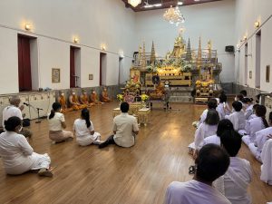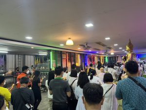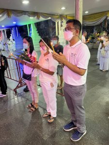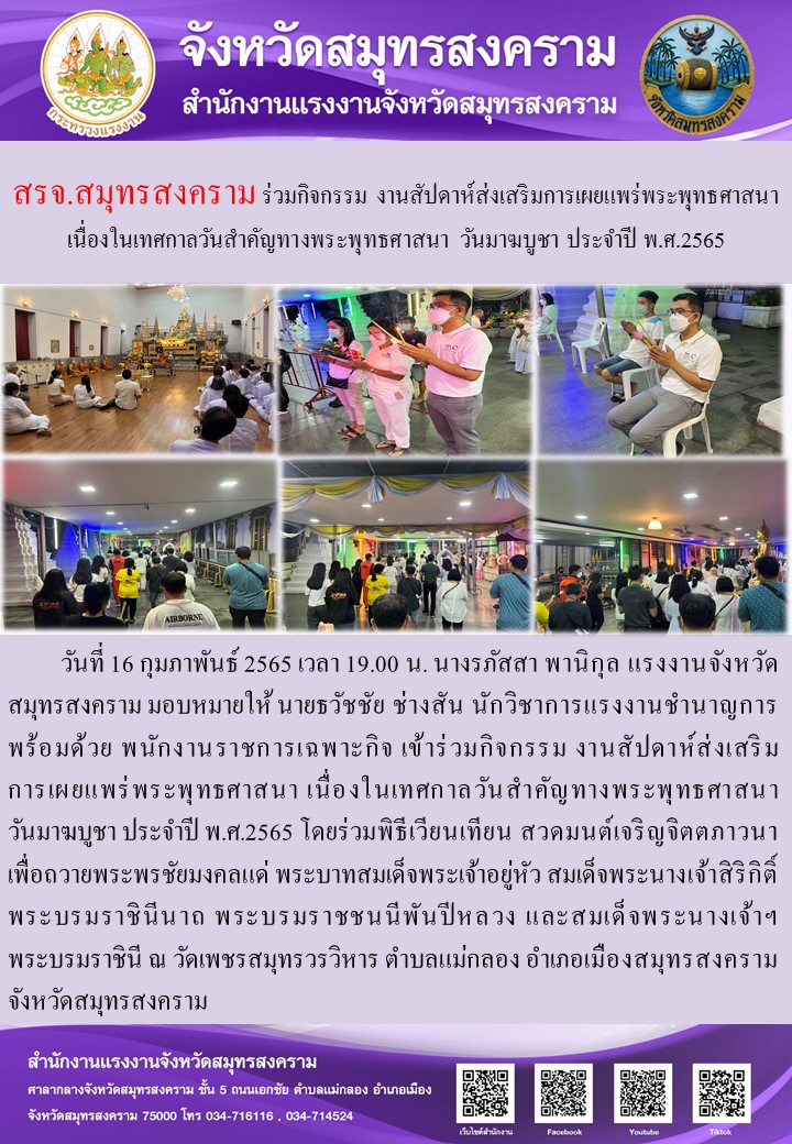 วันที่ 16 กุมภาพันธ์ 2565 เวลา 19.00 น. นางรภัสสา พานิกุล แรงงานจังหวัดสมุทรสงคราม มอบหมายให้ นายธวัชชัย ช่างสัน นักวิชาการแรงงานชำนาญการ พร้อมด้วย พนักงานราชการเฉพาะกิจ เข้าร่วมกิจกรรม งานสัปดาห์ส่งเสริมการเผยแพร่พระพุทธศาสนา เนื่องในเทศกาลวันสำคัญทางพระพุทธศาสนา วันมาฆบูชา ประจำปี พ.ศ.2565 โดยร่วมพิธีเวียนเทียน สวดมนต์เจริญจิตตภาวนา เพื่อถวายพระพรชัยมงคลแด่ พระบาทสมเด็จพระเจ้าอยู่หัว สมเด็จพระนางเจ้าสิริกิติ์ พระบรมราชินีนาถ พระบรมราชชนนีพันปีหลวง และสมเด็จพระนางเจ้าฯ พระบรมราชินี ณ วัดเพชรสมุทรวรวิหาร ตำบลแม่กลอง อำเภอเมืองสมุทรสงคราม จังหวัดสมุทรสงคราม