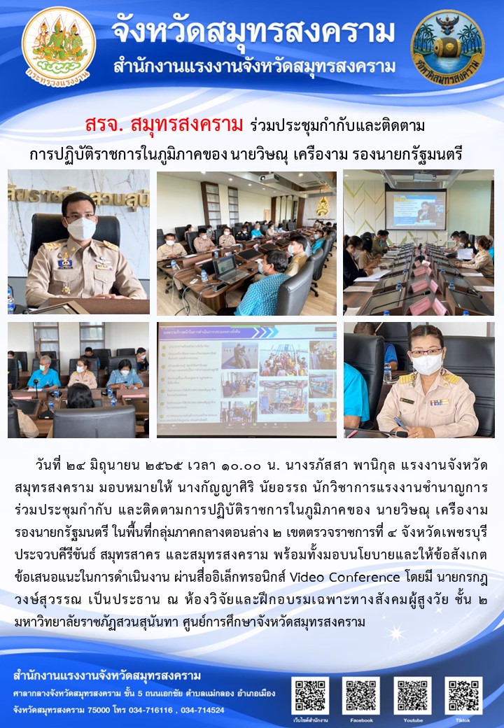 วันที่ 24 มิถุนายน 2565 เวลา 10.00 น. นางรภัสสา พานิกุล แรงงานจังหวัดสมุทรสงคราม มอบหมายให้ นางกัญญาศิริ นัยอรรถ นักวิชาการแรงงานชำนาญการ ร่วมประชุมกำกับ และติดตามการปฏิบัติราชการในภูมิภาคของ นายวิษณุ เครืองาม รองนายกรัฐมนตรี ในพื้นที่กลุ่มภาคกลางตอนล่าง 2 เขตตรวจราชการที่ 4 จังหวัดเพชรบุรี ประจวบคีรีขันธ์ สมุทรสาคร และสมุทรสงคราม พร้อมทั้งมอบนโยบายและให้ข้อสังเกตข้อเสนอแนะในการดำเนินงาน ผ่านสื่ออิเล็กทรอนิกส์ Video Conference โดยมี นายกรกฎ วงษ์สุวรรณ เป็นประธาน ณ ห้องวิจัยและฝึกอบรมเฉพาะทางสังคมผู้สูงวัย ชั้น 2 มหาวิทยาลัยราชภัฏสวนสุนันทา ศูนย์การศึกษาจังหวัดสมุทรสงคราม
