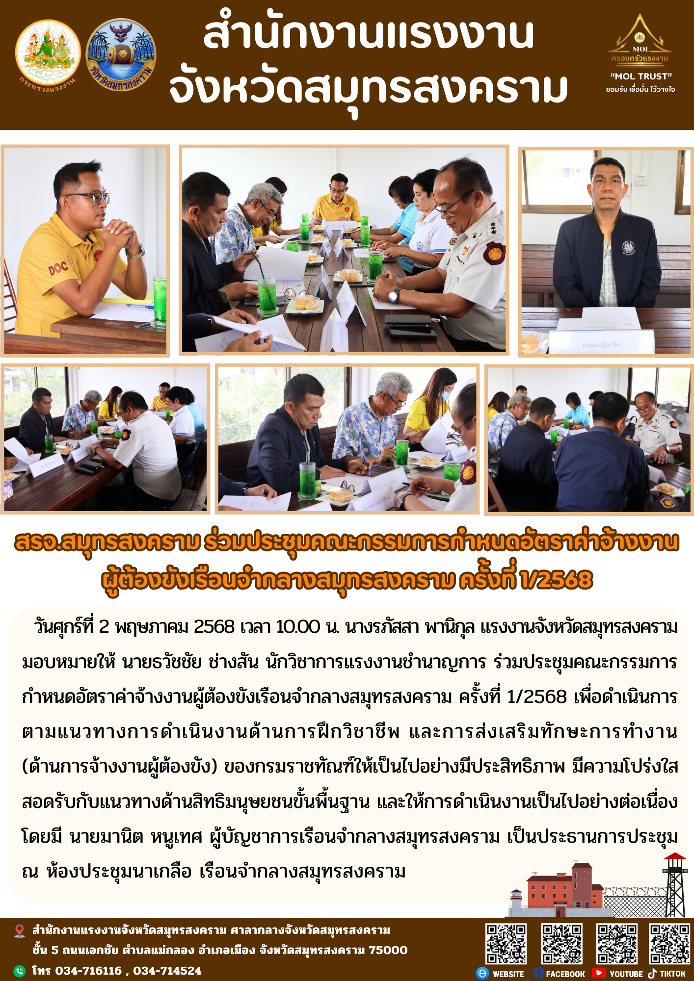 วันศุกร์ที่ 2 พฤษภาคม 2568 เวลา 10.00 น. นางรภัสสา พานิกุลแรงงานจังหวัดสมุทรสงคราม มอบหมายให้ นายธวัชชัย ช่างสัน