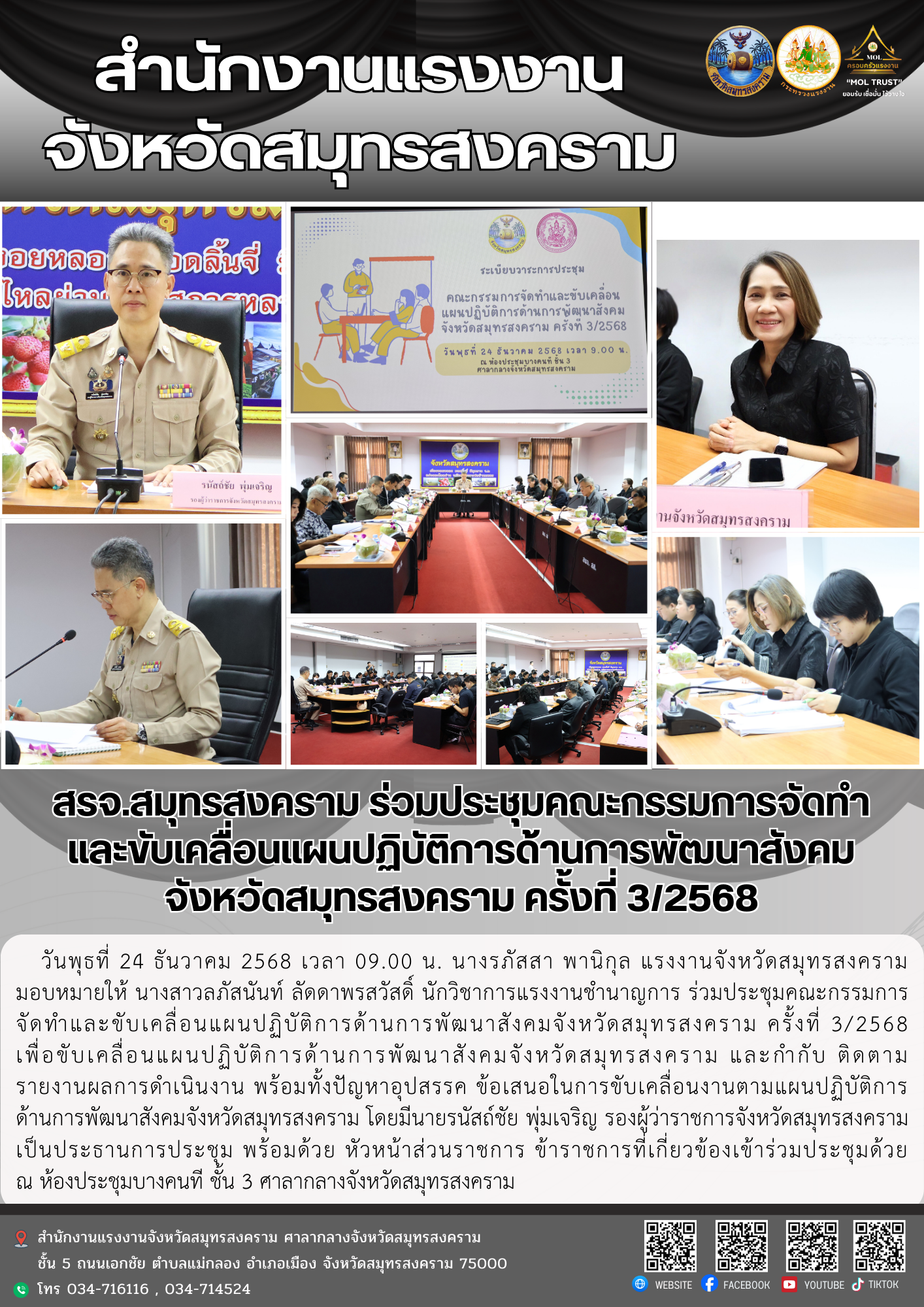วันพุธที่ 24 ธันวาคม 2568 เวลา 09.00 น. นางรภัสสา พานิกุล แรงงานจังหวัดสมุทรสงคราม มอบหมายให้ นางสาวลภัสนันท์ ลัดดาพรสวัสดิ์ นักวิชาการแรงงานชำนาญการ ร่วมประชุมคณะกรรมการจัดทำและขับเคลื่อนแผนปฏิบัติการด้านการพัฒนาสังคมจังหวัดสมุทรสงคราม ครั้งที่ 3/2568 เพื่อขับเคลื่อนแผนปฏิบัติการด้านการพัฒนาสังคมจังหวัดสมุทรสงคราม และกำกับ ติดตาม รายงานผลการดำเนินงาน พร้อมทั้งปัญหาอุปสรรค ข้อเสนอในการขับเคลื่อนงานตามแผนปฏิบัติการ ด้านการพัฒนาสังคมจังหวัดสมุทรสงคราม โดยมีนายรนัสถ์ชัย พุ่มเจริญ รองผู้ว่าราชการจังหวัดสมุทรสงคราม เป็นประธานการประชุม พร้อมด้วย หัวหน้าส่วนราชการ ข้าราชการที่เกี่ยวข้องเข้าร่วมประชุมด้วย ณ ห้องประชุมบางคนที ชั้น 3 ศาลากลางจังหวัดสมุทรสงคราม
