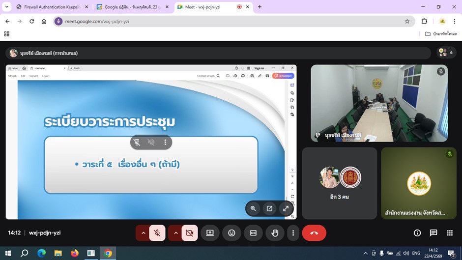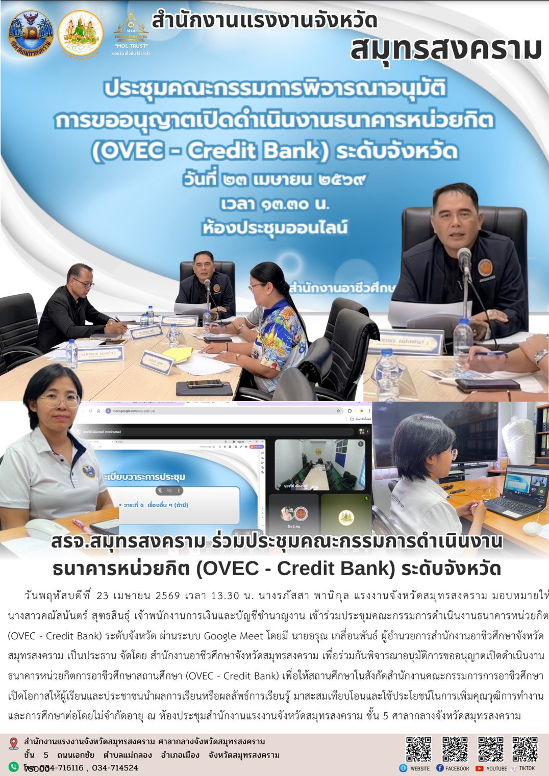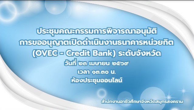 วันพฤหัสบดีที่ 23 เมษายน 2569 เวลา 13.30 น. นางรภัสสา พานิกุล แรงงานจังหวัดสมุทรสงคราม มอบหมายให้นางสาวคณัสนันตร์ สุฑธสินธุ์ เจ้าพนักงานการเงินและบัญชีชำนาญงาน เข้าร่วมประชุมคณะกรรมการดำเนินงานธนาคารหน่วยกิต (OVEC – Credit Bank) ระดับจังหวัด ผ่านระบบ Google Meet โดยมี นายอรุณ เกลื่อนพันธ์ ผู้อำนวยการสำนักงานอาชีวศึกษาจังหวัดสมุทรสงคราม เป็นประธาน จัดโดย สำนักงานอาชีวศึกษาจังหวัดสมุทรสงคราม เพื่อร่วมกันพิจารณาอนุมัติการขออนุญาตเปิดดำเนินงานธนาคารหน่วยกิตการอาชีวศึกษาสถานศึกษา (OVEC – Credit Bank) เพื่อให้สถานศึกษาในสังกัดสำนักงานคณะกรรมการการอาชีวศึกษาเปิดโอกาสให้ผู้เรียนและประชาชนนำผลการเรียนหรือผลลัพธ์การเรียนรู้ มาสะสมเทียบโอนและใช้ประโยชน์ในการเพิ่มคุณวุฒิการทำงาน และการศึกษาต่อโดยไม่จำกัดอายุ ณ ห้องประชุมสำนักงานแรงงานจังหวัดสมุทรสงคราม ชั้น 5 ศาลากลางจังหวัดสมุทรสงคราม