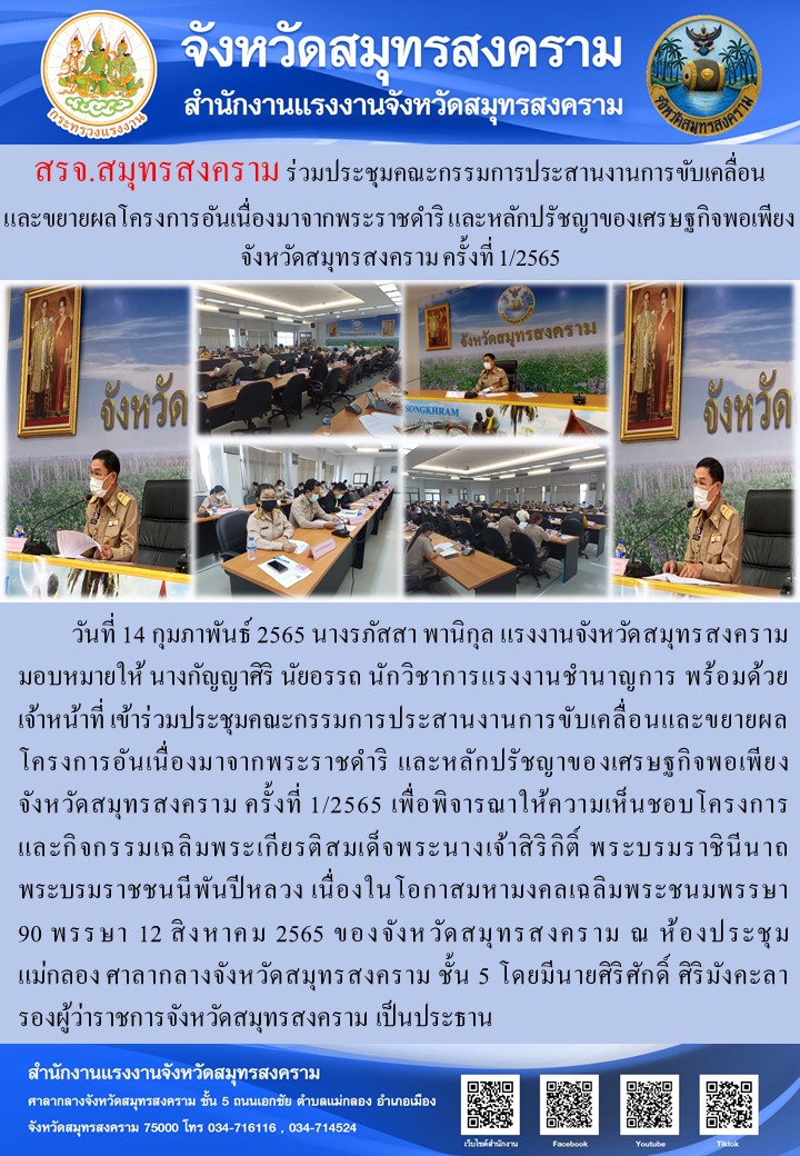 วันที่ 14 กุมภาพันธ์ 2565 นางรภัสสา พานิกุล แรงงานจังหวัดสมุทรสงคราม มอบหมายให้ นางกัญญาศิริ นัยอรรถ นักวิชาการแรงงานชำนาญการ พร้อมด้วยเจ้าหน้าที่ เข้าร่วมประชุมคณะกรรมการประสานงานการขับเคลื่อนและขยายผลโครงการอันเนื่องมาจากพระราชดำริ และหลักปรัชญาของเศรษฐกิจพอเพียง จังหวัดสมุทรสงคราม ครั้งที่ 1/2565 เพื่อพิจารณาให้ความเห็นชอบโครงการและกิจกรรมเฉลิมพระเกียรติสมเด็จพระนางเจ้าสิริกิติ์ พระบรมราชินีนาถ พระบรมราชชนนีพันปีหลวง เนื่องในโอกาสมหามงคลเฉลิมพระชนมพรรษา 90 พรรษา 12 สิงหาคม 2565 ของจังหวัดสมุทรสงคราม ณ ห้องประชุมแม่กลอง ศาลากลางจังหวัดสมุทรสงคราม ชั้น 5 โดยมีนายศิริศักดิ์ ศิริมังคะลารองผู้ว่าราชการจังหวัดสมุทรสงคราม เป็นประธาน
