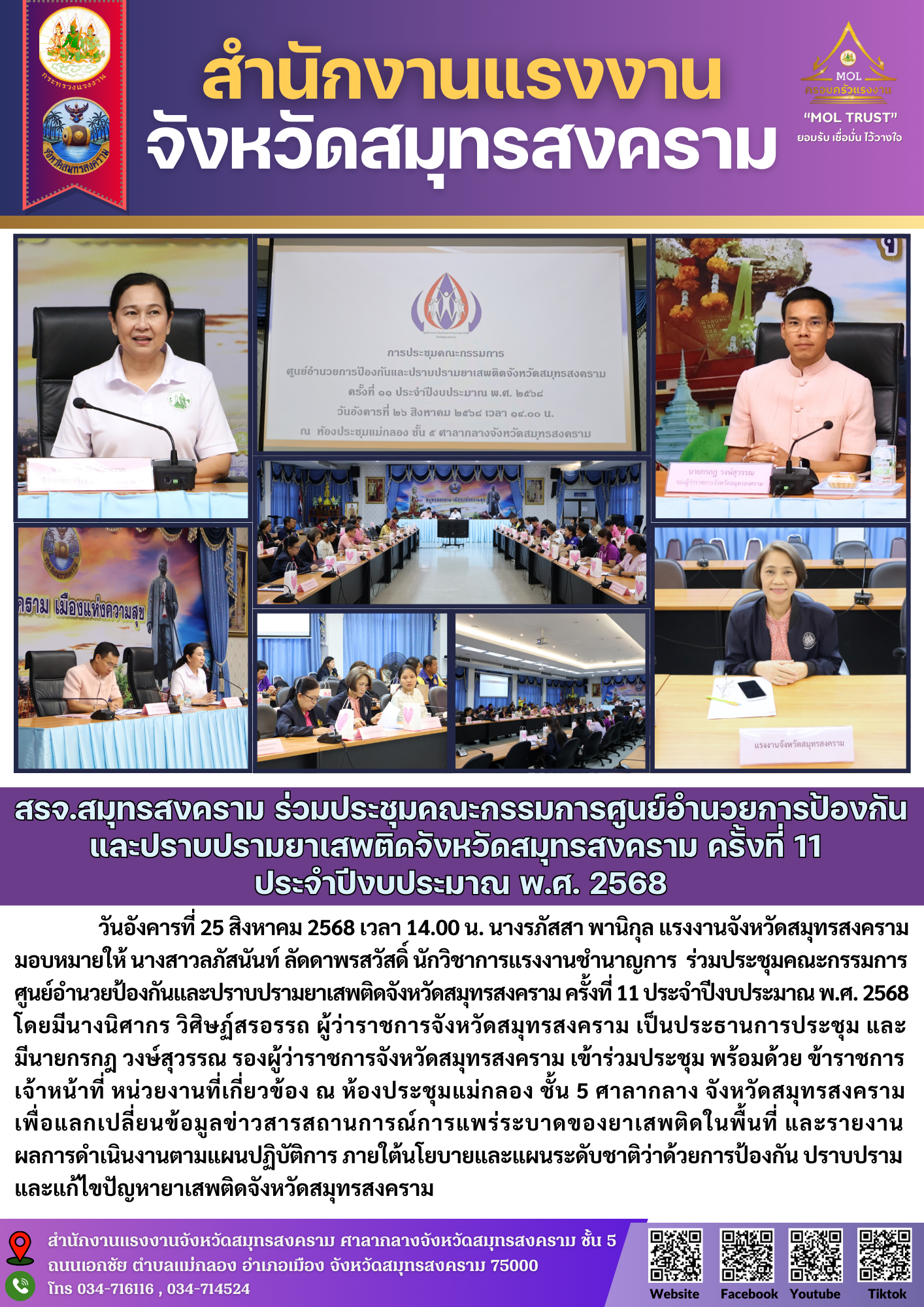 วันอังคารที่ 25 สิงหาคม 2568 เวลา 14.00 น. นางรภัสสา พานิกุล แรงงานจังหวัดสมุทรสงคราม มอบหมายให้ นางสาวลภัสนันท์ ลัดดาพรสวัสดิ์ นักวิชาการแรงงานชำนาญการ ร่วมประชุมคณะกรรมการศูนย์อำนวยป้องกันและปราบปรามยาเสพติดจังหวัดสมุทรสงคราม ครั้งที่ 11 ประจำปีงบประมาณ พ.ศ. 2568 โดยมีนางนิศากร วิศิษฏ์สรอรรถ ผู้ว่าราชการจังหวัดสมุทรสงคราม เป็นประธานการประชุม และมีนายกรกฎ วงษ์สุวรรณ รองผู้ว่าราชการจังหวัดสมุทรสงคราม เข้าร่วมประชุม พร้อมด้วย ข้าราชการเจ้าหน้าที่ หน่วยงานที่เกี่ยวข้อง ณ ห้องประชุมแม่กลอง ชั้น 5 ศาลากลาง จังหวัดสมุทรสงคราม เพื่อแลกเปลี่ยนข้อมูลข่าวสารสถานการณ์การแพร่ระบาดของยาเสพติดในพื้นที่ และรายงานผลการดำเนินงานตามแผนปฏิบัติการ ภายใต้นโยบายและแผนระดับชาติว่าด้วยการป้องกัน ปราบปราม และแก้ไขปัญหายาเสพติดจังหวัดสมุทรสงคราม