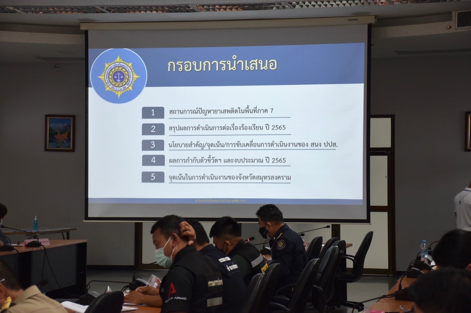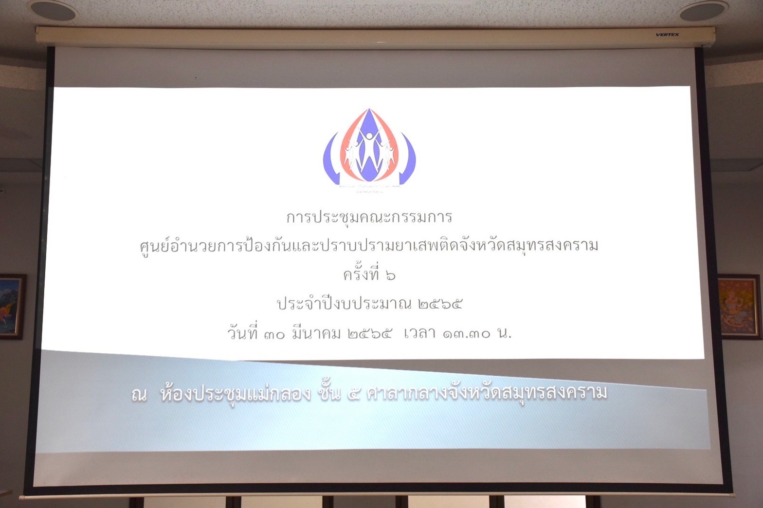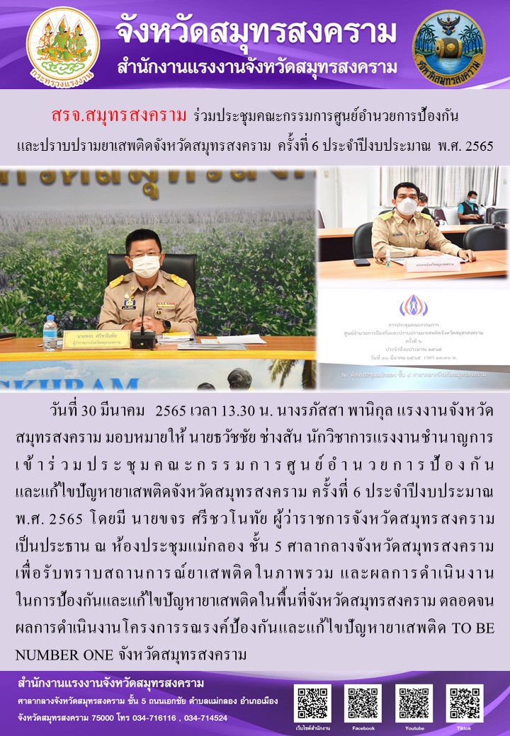 วันที่ 30 มีนาคม 2565 เวลา 13.30 น. นางรภัสสา พานิกุล แรงงานจังหวัดสมุทรสงคราม มอบหมายให้ นายธวัชชัย ช่างสัน นักวิชาการแรงงานชำนาญการ เข้าร่วมประชุมคณะกรรมการศูนย์อำนวยการป้องกันและแก้ไขปัญหายาเสพติดจังหวัดสมุทรสงคราม ครั้งที่ 6 ประจำปีงบประมาณ พ.ศ. 2565 โดยมี นายขจร ศรีชวโนทัย ผู้ว่าราชการจังหวัดสมุทรสงคราม เป็นประธาน ณ ห้องประชุมแม่กลอง ชั้น 5 ศาลากลางจังหวัดสมุทรสงคราม เพื่อรับทราบสถานการณ์ยาเสพติดในภาพรวม และผลการดำเนินงานในการป้องกันและแก้ไขปัญหายาเสพติดในพื้นที่จังหวัดสมุทรสงคราม ตลอดจนผลการดำเนินงานโครงการรณรงค์ป้องกันและแก้ไขปัญหายาเสพติด TO BE NUMBER ONE จังหวัดสมุทรสงคราม