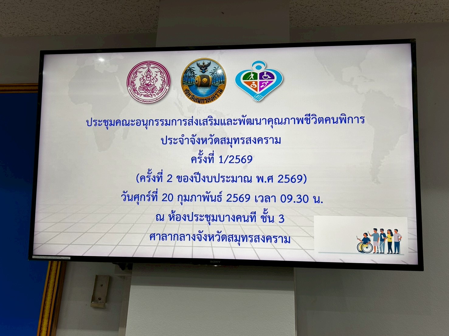 วันศุกร์ที่ 20 กุมภาพันธ์ 2569 เวลา 09.30 น. นางรภัสสา พานิกุล แรงงานจังหวัดสมุทรสงคราม มอบหมายให้ นางสาวลภัสนันท์ ลัดดาพรสวัสดิ์ นักวิชาการแรงงานชำนาญการ เข้าร่วมประชุมคณะกรรมการส่งเสริมและพัฒนาคุณภาพชีวิตคนพิการประจำจังหวัดสมุทรสงคราม ครั้งที่ 1/2569โดยมี นายรนัสถ์ชัย พุ่มเจริญ รองผู้ว่าราชการจังหวัดสมุทรสงคราม เป็นประธานในการประชุม ณ ห้องประชุมอัมพวา ชั้น 4 ศาลากลางจังหวัดสมุทรสงคราม ซึ่งจัดโดย สำนักงานพัฒนาสังคมและความมั่นคงของมนุษย์จังหวัดสมุทรสงคราม เพื่อรับทราบรายงานสถานการณ์คนพิการในจังหวัดสมุทรสงคราม รายงานสถานะการเงินและการบริหารกองทุนส่งเสริมและพัฒนาคุณภาพชีวิตคนพิการ ประจำปีงบประมาณ พ.ศ. 2569 ตลอดจนผลการดำเนินโครงการที่เกี่ยวข้อง พร้อมทั้งพิจารณาคำขอกู้ยืมเงินทุนประกอบอาชีพจากกองทุนส่งเสริมและพัฒนาคุณภาพชีวิตคนพิการสำหรับคนพิการ หรือผู้ดูแลคนพิการ จำนวน 9 ราย และพิจารณากรอบวงเงินสนับสนุนศูนย์บริการคนพิการทั่วไป ประจำปีงบประมาณ พ.ศ.2569 จำนวน 2 ศูนย์