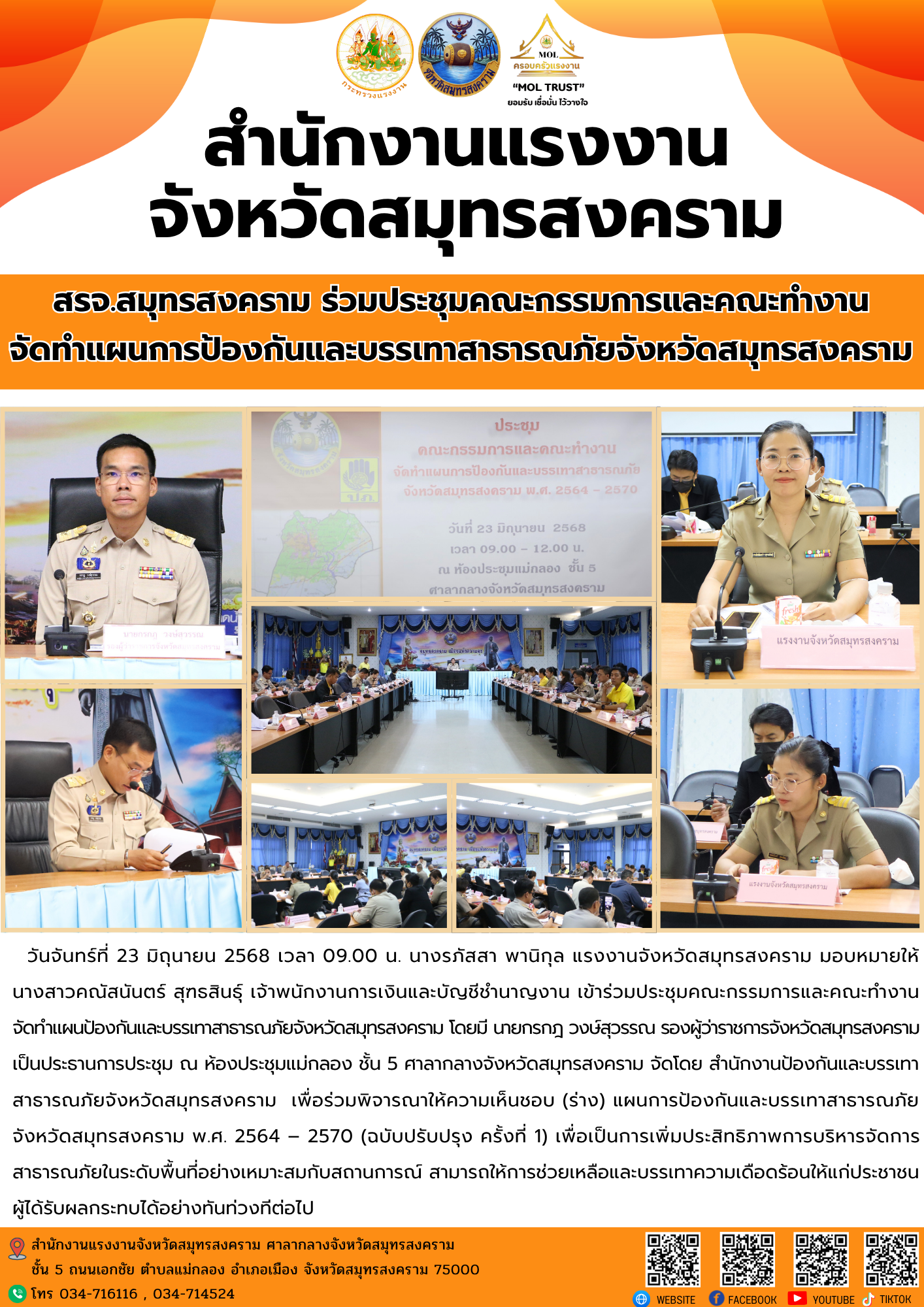 วันจันทร์ที่ 23 มิถุนายน 2568 เวลา 09.00 น. นางรภัสสา พานิกุล แรงงานจังหวัดสมุทรสงคราม มอบหมายให้