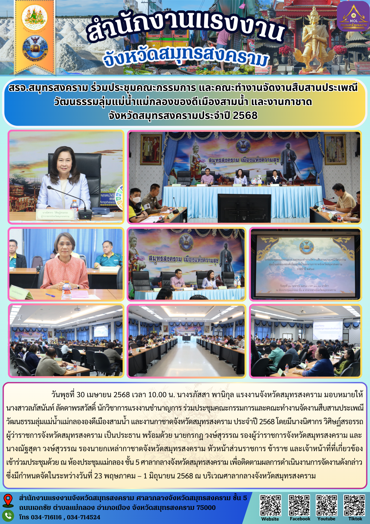 วันพุธที่ 30 เมษายน 2568 เวลา 10.00 น. นางรภัสสา พานิกุล แรงงานจังหวัดสมุทรสงคราม มอบหมายให้ นางสาวลภัสนันท์ ลัดดาพรสวัสดิ์ นักวิชาการแรงงานชำนาญการ ร่วมประชุมคณะกรรมการและคณะทำงานจัดงานสืบสานประเพณีวัฒนธรรมลุ่มแม่น้ำแม่กลององดีเมืองสามน้ำ และงานกาชาดจังหวัดสมุทรสงคราม ประจำปี 2568 โดยมีนางนิศากร วิศิษฏ์สรอรรถ ผู้ว่าราชการจังหวัดสมุทรสงคราม เป็นประธาน พร้อมด้วย นายกรกฎ วงษ์สุวรรณ รองผู้ว่าราชการจังหวัดสมุทรสงคราม และนางณัฐสุดา วงษ์สุวรรณ รองนายกเหล่ากาชาดจังหวัดสมุทรสงคราม หัวหน้าส่วนราชการ ข้าราช และเจ้าหน้าที่ที่เกี่ยวข้องเข้าร่วมประชุมด้วย ณ ห้องประชุมแม่กลอง ชั้น 5 ศาลากลางจังหวัดสมุทรสงคราม เพื่อติดตามผลการดำเนินงานการจัดงานดังกล่าว ซึ่งมีกำหนดจัดในระหว่างวันที่ 23 พฤษภาคม – 1 มิถุนายน 2568 ณ บริเวณศาลากลางจังหวัดสมุทรสงคราม