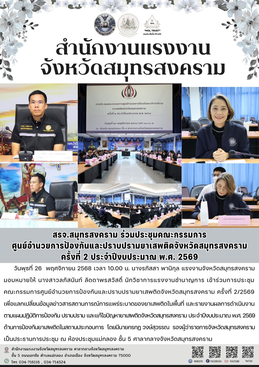 วันพุธที่ 26 พฤศจิกายน 2568 เวลา 09.00 น. นางรภัสสา พานิกุล แรงงานจังหวัดสมุทรสงคราม มอบหมายให้ นางสาวลภัสนันท์ ลัดดาพรสวัสดิ์ นักวิชาการแรงงานชำนาญการ ร่วมประชุมคณะทำงานเฝ้าระวังปัญหายาเสพติดจังหวัดสมุทรสงคราม “โต๊ะข่าว” ครั้งที่ 2/2569 เพื่อแลกเปลี่ยนข้อมูล ข่าวสารสถานการณ์การแพร่ระบาดของยาเสพติดในพื้นที่ การวิเคราะห์สถานการณ์ปัญหายาเสพติด ด้านการค้า การแพร่ระบาด การบำบัดรักษา สถานการณ์ปัญหายาเสพติดของเด็กและเยาวชนทั้งในและนอกสถานศึกษา และการวิเคราะห์ปัญหายาเสพติดในสถานประกอบการ โดยมี นายอรรถพันธุ์ สงวนเสริมศรี ปลัดจังหวัดสมุทรสงคราม เป็นประธานการประชุม ณ ห้องประชุมแม่กลอง ชั้น 5 ศาลากลางจังหวัดสมุทรสงคราม