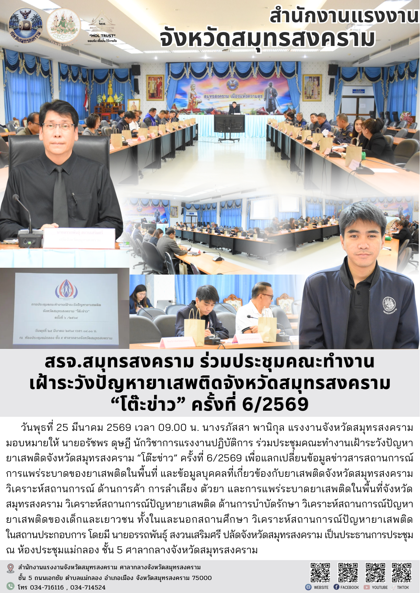 วันพุธที่ 25 มีนาคม 2569 เวลา 09.00 น. นางรภัสสา พานิกุล แรงงานจังหวัดสมุทรสงคราม มอบหมายให้ นายอรัชพร ดุษฎี นักวิชาการแรงงานปฏิบัติการ ร่วมประชุมคณะทำงานเฝ้าระวังปัญหายาเสพติดจังหวัดสมุทรสงคราม “โต๊ะข่าว” ครั้งที่ 6/2569 เพื่อแลกเปลี่ยนข้อมูลข่าวสารสถานการณ์การแพร่ระบาดของยาเสพติดในพื้นที่ และข้อมูลบุคคลที่เกี่ยวข้องกับยาเสพติดจังหวัดสมุทรสงคราม วิเคราะห์สถานการณ์ ด้านการค้า การลำเลียง ตัวยา และการแพร่ระบาดยาเสพติดในพื้นที่จังหวัดสมุทรสงคราม วิเคราะห์สถานการณ์ปัญหายาเสพติด ด้านการบำบัดรักษา วิเคราะห์สถานการณ์ปัญหายาเสพติดของเด็กและเยาวชน ทั้งในและนอกสถานศึกษา วิเคราะห์สถานการณ์ปัญหายาเสพติดในสถานประกอบการ โดยมี นายอรรถพันธุ์ สงวนเสริมศรี ปลัดจังหวัดสมุทรสงคราม เป็นประธานการประชุม ณ ห้องประชุมแม่กลอง ชั้น 5 ศาลากลางจังหวัดสมุทรสงคราม