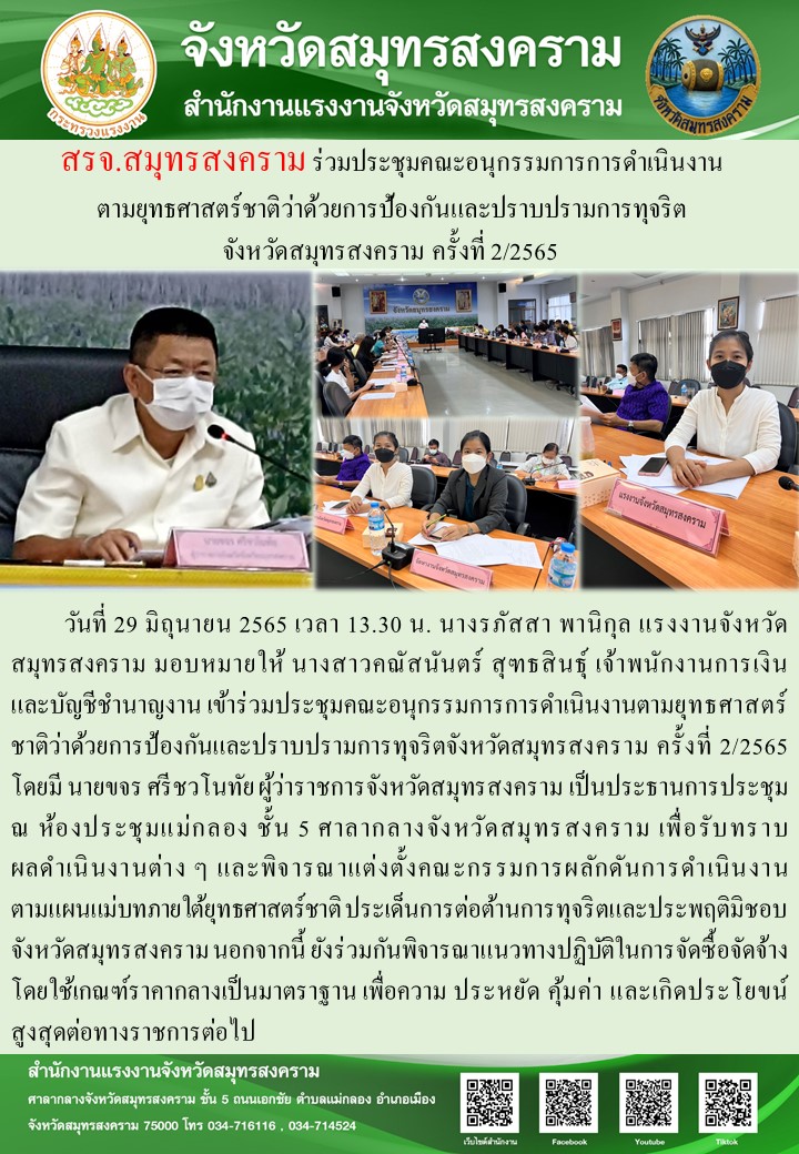 วันที่ 29 มิถุนายน 2565 เวลา 13.30 น. นางรภัสสา พานิกุล แรงงานจังหวัดสมุทรสงคราม มอบหมายให้ นางสาวคณัสนันตร์ สุฑธสินธุ์ เจ้าพนักงานการเงินและบัญชีชำนาญงาน เข้าร่วมประชุมคณะอนุกรรมการการดำเนินงานตามยุทธศาสตร์ชาติว่าด้วยการป้องกันและปราบปรามการทุจริตจังหวัดสมุทรสงคราม ครั้งที่ 2/2565 โดยมี นายขจร ศรีชวโนทัย ผู้ว่าราชการจังหวัดสมุทรสงคราม เป็นประธานการประชุม ณ ห้องประชุมแม่กลอง ชั้น 5 ศาลากลางจังหวัดสมุทรสงคราม เพื่อรับทราบผลดำเนินงานต่าง ๆ และพิจารณาแต่งตั้งคณะกรรมการผลักดันการดำเนินงานตามแผนแม่บทภายใต้ยุทธศาสตร์ชาติ ประเด็นการต่อต้านการทุจริตและประพฤติมิชอบ จังหวัดสมุทรสงคราม นอกจากนี้ ยังร่วมกันพิจารณาแนวทางปฏิบัติในการจัดซื้อจัดจ้างโดยใช้เกณฑ์ราคากลางเป็นมาตราฐาน เพื่อความ ประหยัด คุ้มค่า และเกิดประโยขน์สูงสุดต่อทางราชการต่อไป