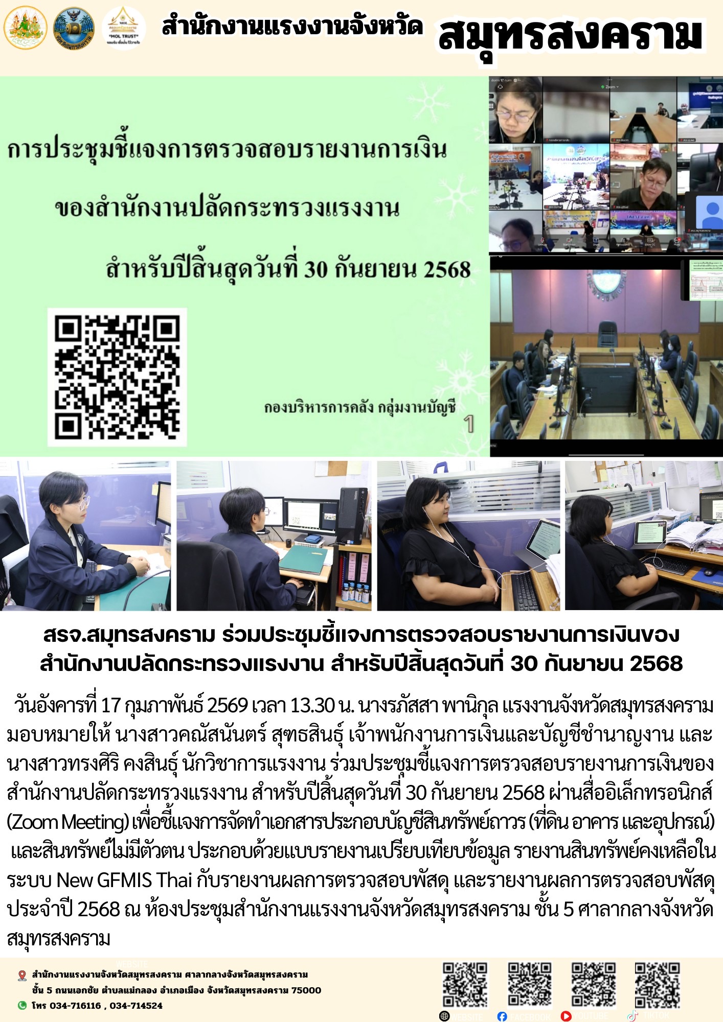 วันอังคารที่ 17 กุมภาพันธ์ 2569 เวลา 13.30 น. นางรภัสสา พานิกุล แรงงานจังหวัดสมุทรสงคราม มอบหมายให้ นางสาวคณัสนันตร์ สุฑธสินธุ์ เจ้าพนักงานการเงินและบัญชีชำนาญงาน และนางสาวทรงศิริ คงสินธุ์ นักวิชาการแรงงาน ร่วมประชุมชี้แจงการตรวจสอบรายงานการเงินของ สำนักงานปลัดกระทรวงแรงงาน สำหรับปีสิ้นสุดวันที่ 30 กันยายน 2568 ผ่านสื่ออิเล็กทรอนิกส์ (Zoom Meeting) เพื่อชี้แจงการจัดทำเอกสารประกอบบัญชีสินทรัพย์ถาวร (ที่ดิน อาคาร และอุปกรณ์) และสินทรัพย์ไม่มีตัวตน ประกอบด้วยแบบรายงานเปรียบเทียบข้อมูล รายงานสินทรัพย์คงเหลือในระบบ New GFMIS Thai กับรายงานผลการตรวจสอบพัสดุ และรายงานผลการตรวจสอบพัสดุประจำปี 2568 ณ ห้องประชุมสำนักงานแรงงานจังหวัดสมุทรสงคราม ชั้น 5 ศาลากลางจังหวัดสมุทรสงคราม