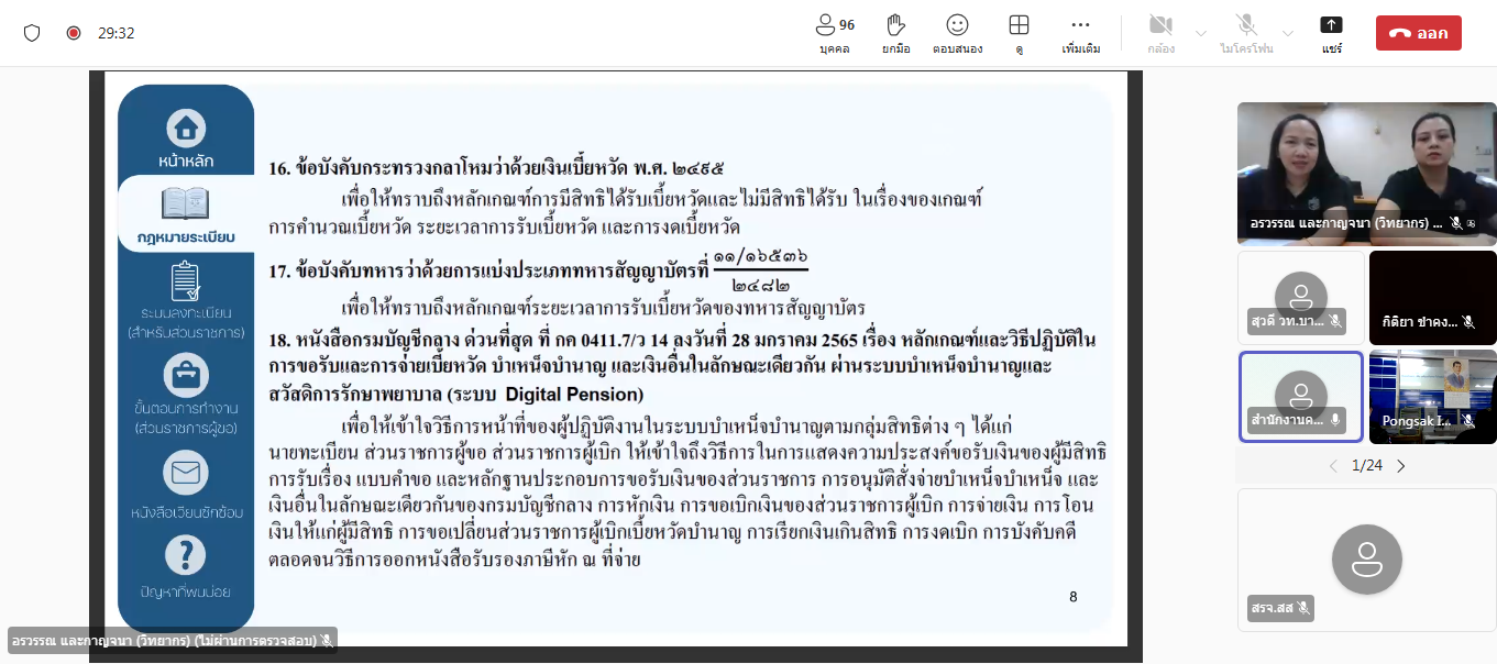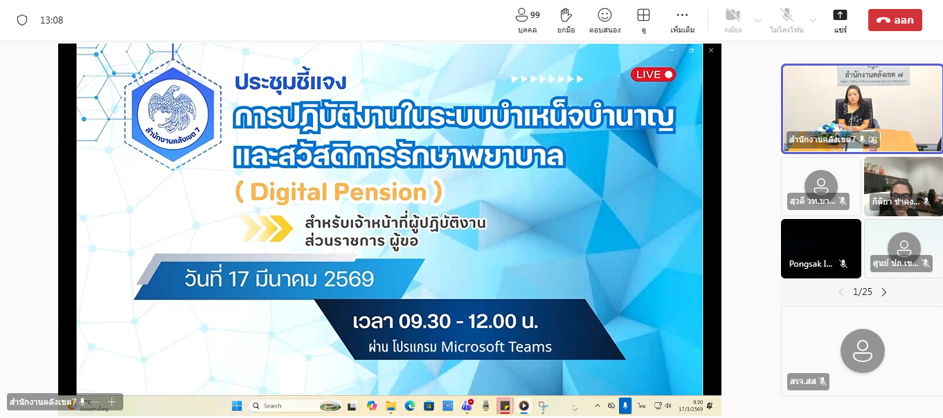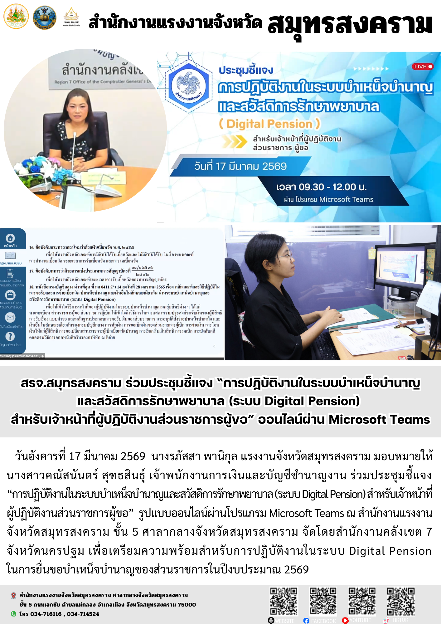 วันอังคารที่ 17 มีนาคม 2569 นางรภัสสา พานิกุล แรงงานจังหวัดสมุทรสงคราม มอบหมายให้ นางสาวคณัสนันตร์ สุฑธสินธุ์ เจ้าพนักงานการเงินและบัญชีชำนาญงาน ร่วมประชุมชี้แจง “การปฏิบัติงานในระบบบำเหน็จบำนาญและสวัสดิการรักษาพยาบาล (ระบบ Digital Pension) สำหรับเจ้าหน้าที่ผู้ปฏิบัติงานส่วนราชการผู้ขอ” รูปแบบออนไลน์ผ่านโปรแกรม Microsoft Teams ณ สำนักงานแรงงานจังหวัดสมุทรสงคราม ชั้น 5 ศาลากลางจังหวัดสมุทรสงคราม จัดโดยสำนักงานคลังเขต 7 จังหวัดนครปฐม เพื่อเตรียมความพร้อมสำหรับการปฏิบัติงานในระบบ Digital Pension ในการยื่นขอบำเหน็จบำนาญของส่วนราชการในปีงบประมาณ 2569