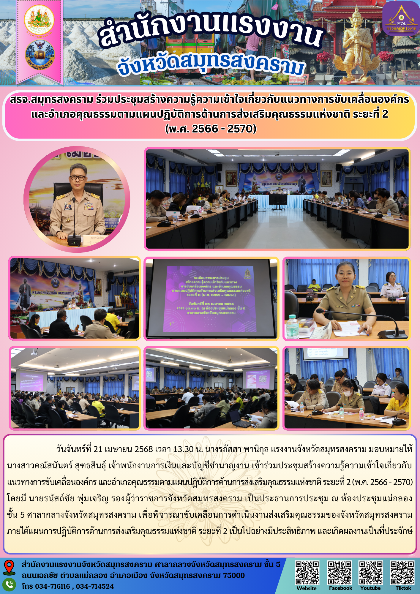 วันจันทร์ที่ 21 เมษายน 2568 เวลา 13.30 น. นางรภัสสา พานิกุล แรงงานจังหวัดสมุทรสงคราม มอบหมายให้ นางสาวคณัสนันตร์ สุฑธสินธุ์ เจ้าพนักงานการเงินและบัญชีชำนาญงาน เข้าร่วมประชุมสร้างความรู้ความเข้าใจเกี่ยวกับแนวทางการขับเคลื่อนองค์กร และอำเภอคุณธรรมตามแผนปฏิบัติการด้านการส่งเสริมคุณธรรมแห่งชาติ ระยะที่ 2 (พ.ศ. 2566 – 2570) โดยมี นายรนัสถ์ชัย พุ่มเจริญ รองผู้ว่าราชการจังหวัดสมุทรสงคราม เป็นประธานการประชุม ณ ห้องประชุมแม่กลอง ชั้น 5 ศาลากลางจังหวัดสมุทรสงคราม เพื่อพิจารณาขับเคลื่อนการดำเนินงานส่งเสริมคุณธรรมของจังหวัดสมุทรสงคราม ภายใต้แผนการปฏิบัติการด้านการส่งเสริมคุณธรรมแห่งชาติ ระยะที่ 2 เป็นไปอย่างมีประสิทธิภาพ และเกิดผลงานเป็นที่ประจักษ์