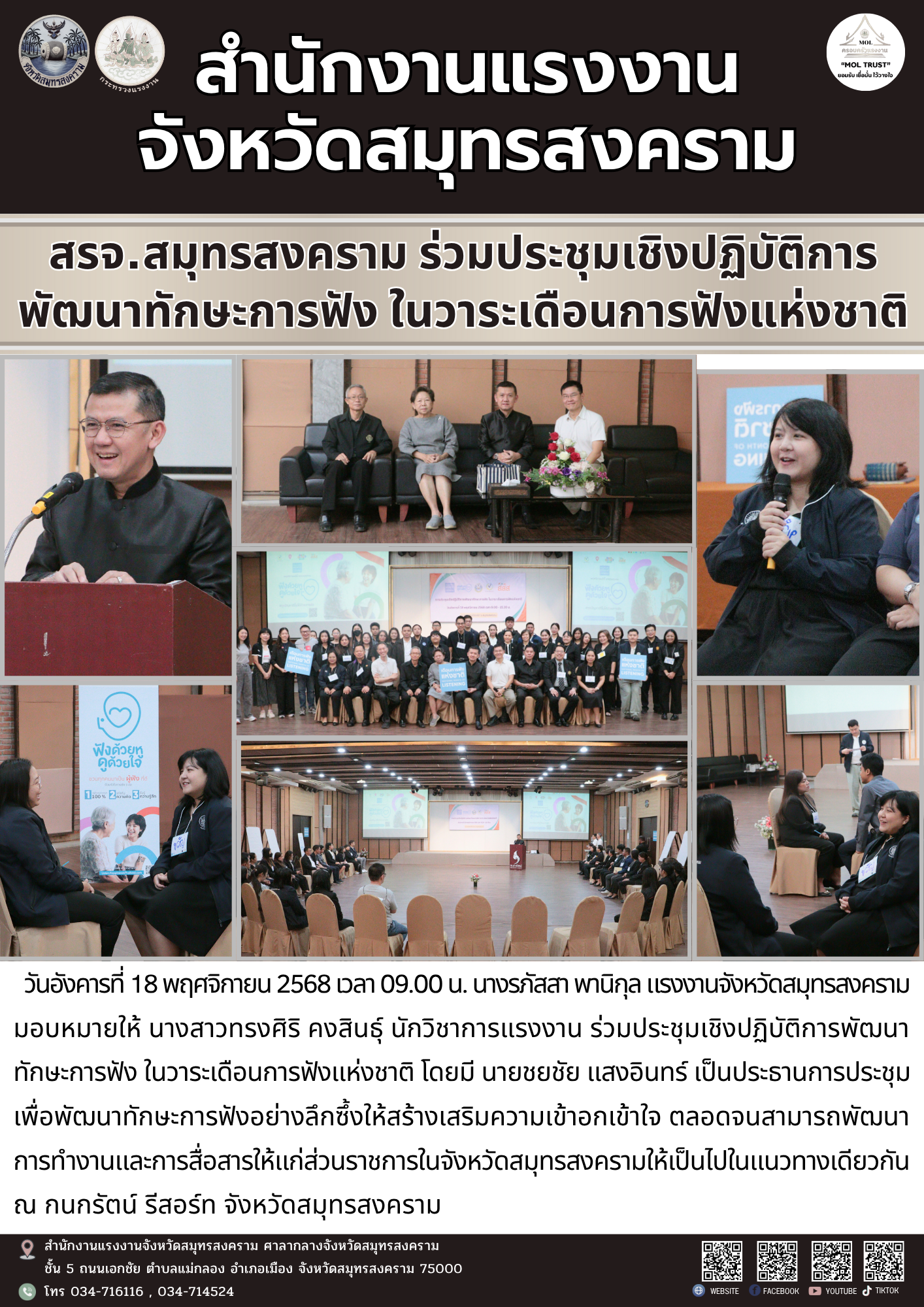 วันอังคารที่ 18 พฤศจิกายน 2568 เวลา 09.00 น. นางรภัสสา พานิกุล แรงงานจังหวัดสมุทรสงคราม มอบหมายให้ นางสาวทรงศิริ คงสินธุ์ นักวิชาการแรงงาน ร่วมประชุมเชิงปฏิบัติการพัฒนาทักษะการฟัง ในวาระเดือนการฟังแห่งชาติ โดยมี นายชยชัย แสงอินทร์ เป็นประธานการประชุม เพื่อพัฒนาทักษะการฟังอย่างลึกซึ้งให้สร้างเสริมความเข้าอกเข้าใจ ตลอดจนสามารถพัฒนาการทำงานและการสื่อสารให้แก่ส่วนราชการในจังหวัดสมุทรสงครามให้เป็นไปในแนวทางเดียวกัน ณ กนกรัตน์ รีสอร์ท จังหวัดสมุทรสงคราม