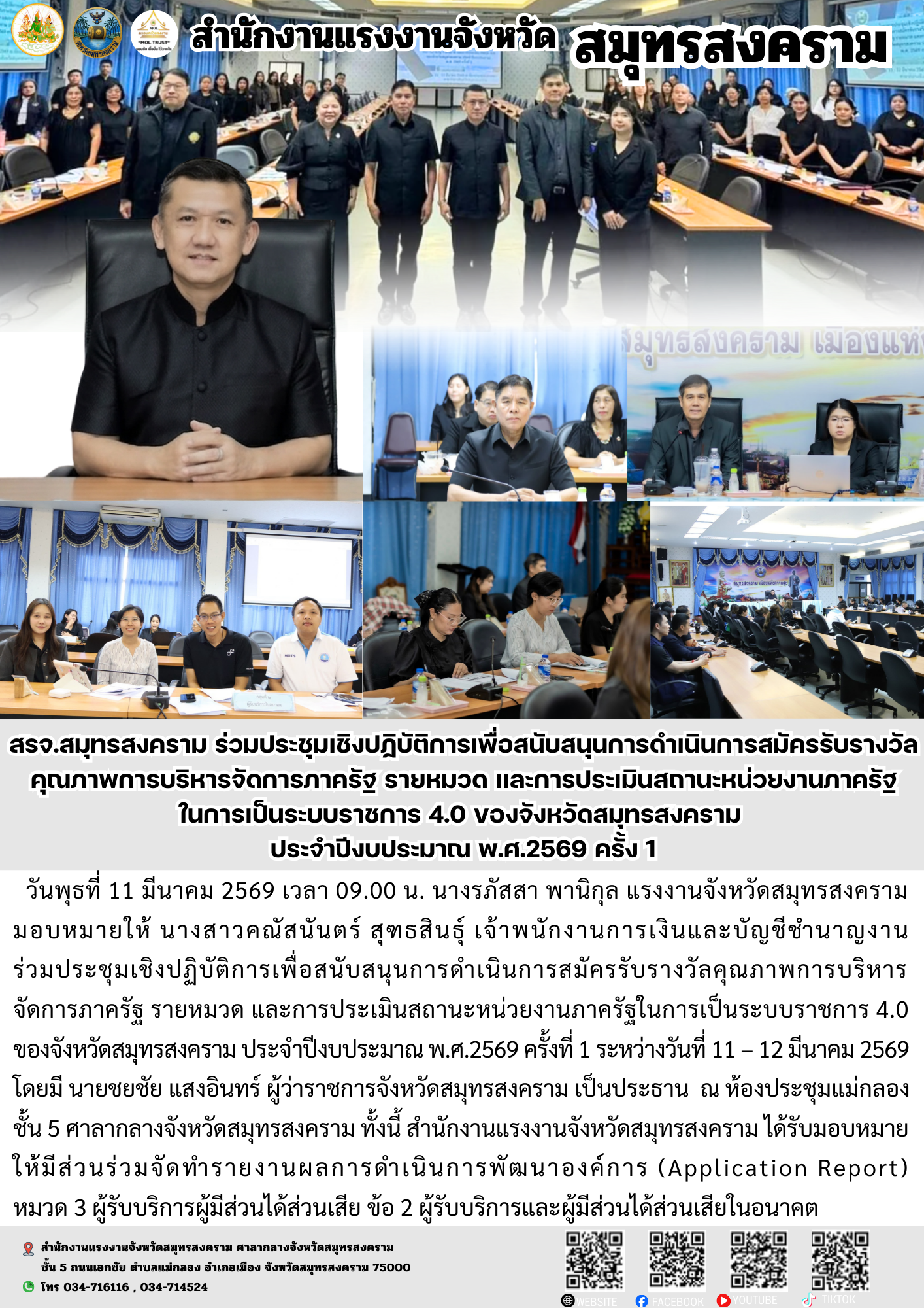 วันพุธที่ 11 มีนาคม 2569 เวลา 09.00 น. นางรภัสสา พานิกุล แรงงานจังหวัดสมุทรสงคราม มอบหมายให้ นางสาวคณัสนันตร์ สุฑธสินธุ์ เจ้าพนักงานการเงินและบัญชีชำนาญงาน ร่วมประชุมเชิงปฏิบัติการเพื่อสนับสนุนการดำเนินการสมัครรับรางวัลคุณภาพการบริหารจัดการภาครัฐ รายหมวด และการประเมินสถานะหน่วยงานภาครัฐในการเป็นระบบราชการ 4.0 ของจังหวัดสมุทรสงคราม ประจำปีงบประมาณ พ.ศ.2569 ครั้งที่ 1 ระหว่างวันที่ 11 – 12 มีนาคม 2569 โดยมี นายชยชัย แสงอินทร์ ผู้ว่าราชการจังหวัดสมุทรสงคราม เป็นประธาน ณ ห้องประชุมแม่กลอง ชั้น 5 ศาลากลางจังหวัดสมุทรสงคราม ทั้งนี้ สำนักงานแรงงานจังหวัดสมุทรสงคราม ได้รับมอบหมาย ให้มีส่วนร่วมจัดทำรายงานผลการดำเนินการพัฒนาองค์การ (Application Report)หมวด 3 ผู้รับบริการผู้มีส่วนได้ส่วนเสีย ข้อ 2 ผู้รับบริการและผู้มีส่วนได้ส่วนเสียในอนาคต