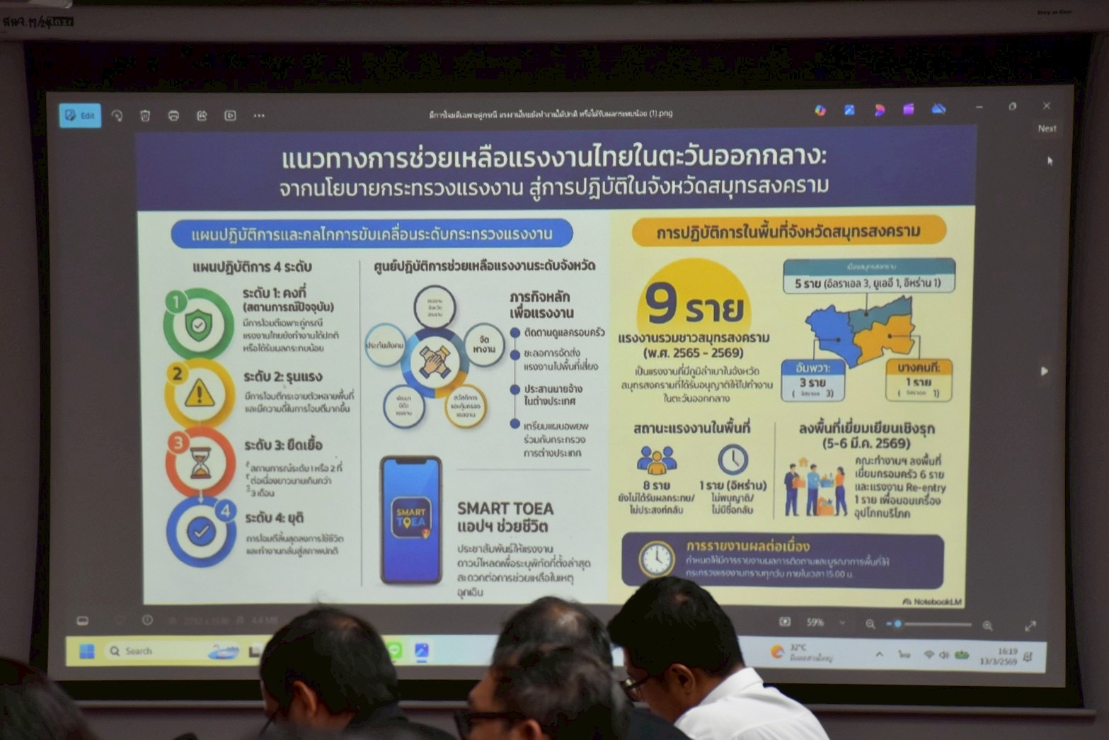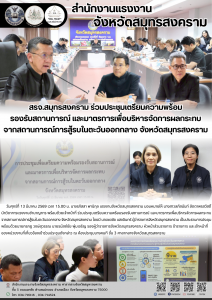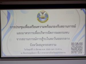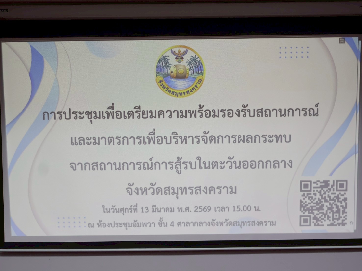 วันศุกร์ที่ 13 มีนาคม 2569 เวลา 15.00 น. นางรภัสสา พานิกุล แรงงานจังหวัดสมุทรสงคราม มอบหมายให้ นางสาวลภัสนันท์ ลัดดาพรสวัสดิ์ นักวิชาการแรงงานชำนาญการ พร้อมด้วยเจ้าหน้าที่ ร่วมประชุมเตรียมความพร้อมรองรับสถานการณ์ และมาตรการเพื่อบริหารจัดการผลกระทบจากสถานการณ์การสู้รบในตะวันออกกลาง จังหวัดสมุทรสงคราม โดยมี นายชยชัย แสงอินทร์ ผู้ว่าราชการจังหวัดสมุทรสงคราม เป็นประธานการประชุม พร้อมด้วยนายกรกฎ วงษ์สุวรรณ นายรนัสถ์ชัย พุ่มเจริญ รองผู้ว่าราชการจังหวัดสมุทรสงคราม หัวหน้าส่วนราชการ ข้าราชการ และเจ้าหน้าที่ของหน่วยงานที่เกี่ยวข้องเข้าร่วมประชุมดังกล่าว ณ ห้องประชุมบางคนที ชั้น 3 ศาลากลางจังหวัดสมุทรสงคราม