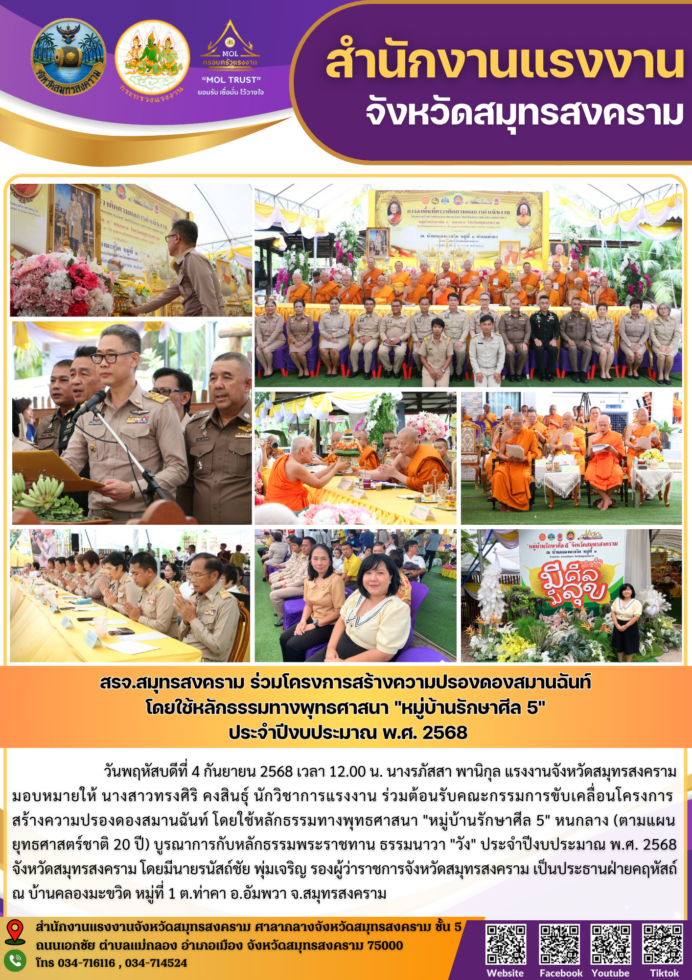 วันพฤหัสบดีที่ 4 กันยายน 2568 เวลา 12.00 น. นางรภัสสา พานิกุล แรงงานจังหวัดสมุทรสงคราม มอบหมายให้ นางสาวทรงศิริ คงสินธุ์ นักวิชาการแรงงาน ร่วมต้อนรับคณะกรรมการขับเคลื่อนโครงการสร้างความปรองดองสมานฉันท์ โดยใช้หลักธรรมทางพุทธศาสนา “หมู่บ้านรักษาศีล 5” หนกลาง (ตามแผนยุทธศาสตร์ชาติ 20 ปี) บูรณาการกับหลักธรรมพระราชทาน ธรรมนาวา “วัง” ประจำปีงบประมาณ พ.ศ. 2568 จังหวัดสมุทรสงคราม โดยมีนายรนัสถ์ชัย พุ่มเจริญ รองผู้ว่าราชการจังหวัดสมุทรสงคราม เป็นประธานฝ่ายคฤหัสถ์ ณ บ้านคลองมะขวิด หมู่ที่ 1 ต.ท่าคา อ.อัมพวา จ.สมุทรสงคราม