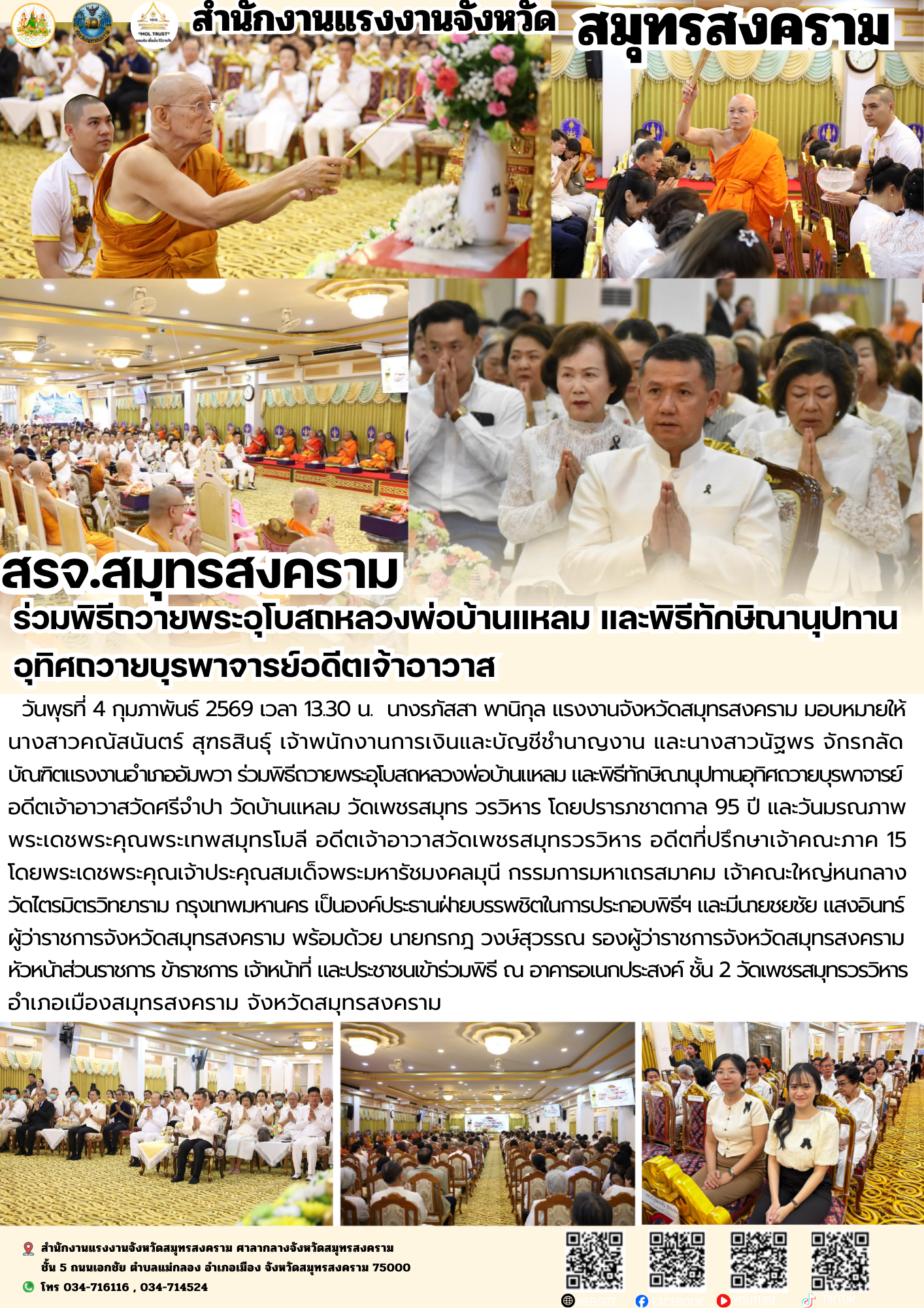 วันพุธที่ 4 กุมภาพันธ์ 2569 เวลา 13.30 น. นางรภัสสา พานิกุล แรงงานจังหวัดสมุทรสงคราม มอบหมายให้ นางสาวคณัสนันตร์ สุฑธสินธุ์ เจ้าพนักงานการเงินและบัญชีชำนาญงาน และนางสาวนัฐพร จักรกลัด บัณฑิตแรงงานอำเภออัมพวา ร่วมพิธีถวายพระอุโบสถหลวงพ่อบ้านแหลม และพิธีทักษิณานุปทานอุทิศถวายบุรพาจารย์อดีตเจ้าอาวาสวัดศรีจำปา วัดบ้านแหลม วัดเพชรสมุทร วรวิหาร โดยปรารภชาตกาล 95 ปี และวันมรณภาพพระเดชพระคุณพระเทพสมุทรโมลี อดีตเจ้าอาวาสวัดเพชรสมุทร วรวิหาร อดีตที่ปรึกษาเจ้าคณะภาค 15 โดยพระเดชพระคุณเจ้าประคุณสมเด็จพระมหารัชมงคลมุนี กรรมการมหาเถรสมาคม เจ้าคณะใหญ่หนกลาง วัดไตรมิตรวิทยาราม กรุงเทพมหานคร เป็นองค์ประธานฝ่ายบรรพชิตในการประกอบพิธีฯ และมีนายชยชัย แสงอินทร์ ผู้ว่าราชการจังหวัดสมุทรสงคราม พร้อมด้วย นายกรกฎ วงษ์สุวรรณ รองผู้ว่าราชการจังหวัดสมุทรสงคราม หัวหน้าส่วนราชการ ข้าราชการ เจ้าหน้าที่ และประชาชนเข้าร่วมพิธี ณ อาคารอเนกประสงค์ ชั้น 2 วัดเพชรสมุทรวรวิหาร อำเภอเมืองสมุทรสงคราม จังหวัดสมุทรสงคราม