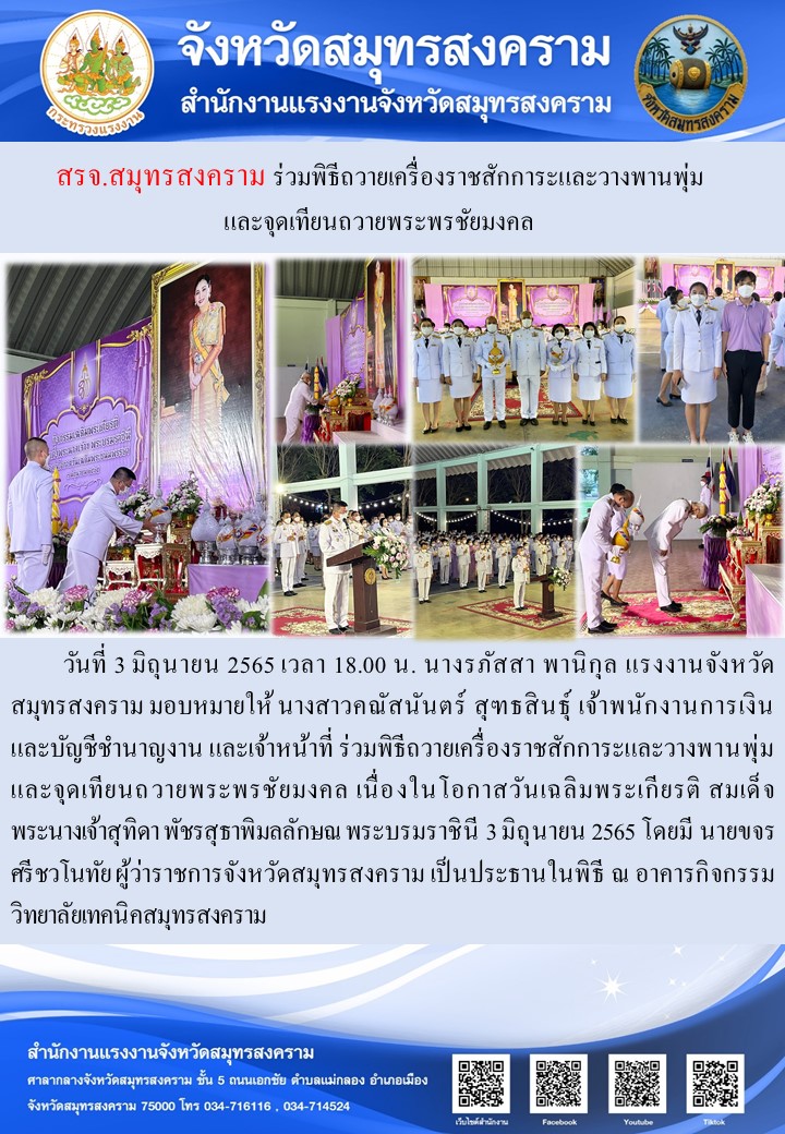 วันที่ 3 มิถุนายน 2565 เวลา 18.00 น. นางรภัสสา พานิกุล แรงงานจังหวัดสมุทรสงคราม มอบหมายให้ นางสาวคณัสนันตร์ สุฑธสินธุ์ เจ้าพนักงานการเงินและบัญชีชำนาญงาน และเจ้าหน้าที่ ร่วมพิธีถวายเครื่องราชสักการะและวางพานพุ่มและจุดเทียนถวายพระพรชัยมงคล เนื่องในโอกาสวันเฉลิมพระเกียรติ สมเด็จพระนางเจ้าสุทิดา พัชรสุธาพิมลลักษณ พระบรมราชินี 3 มิถุนายน 2565 โดยมี นายขจร ศรีชวโนทัย ผู้ว่าราชการจังหวัดสมุทรสงคราม เป็นประธานในพิธี ณ อาคารกิจกรรมวิทยาลัยเทคนิคสมุทรสงคราม