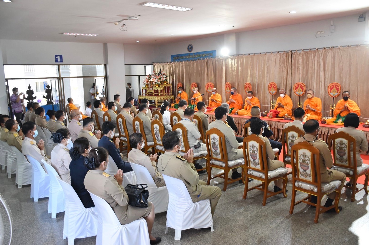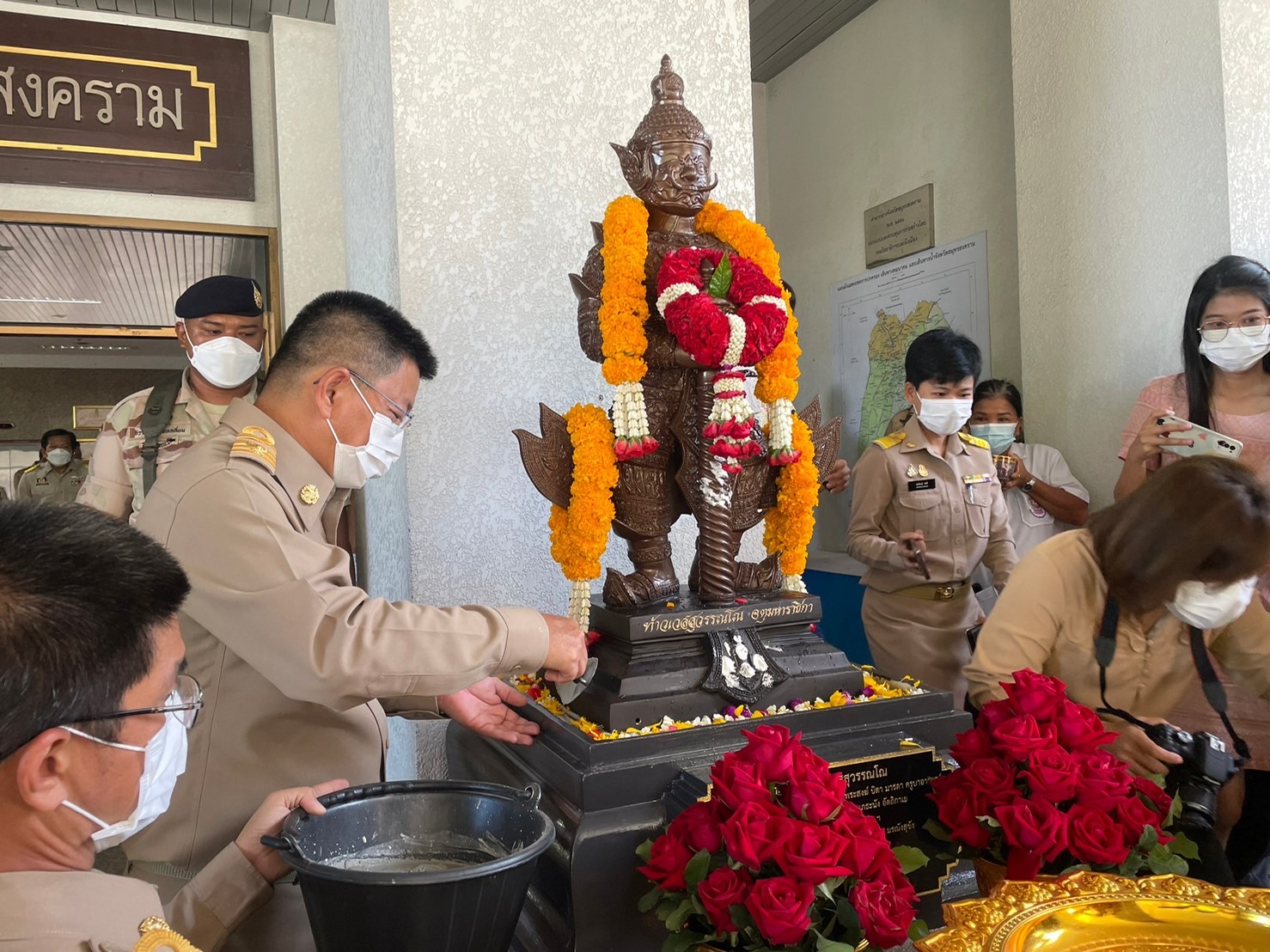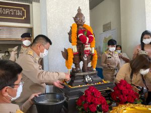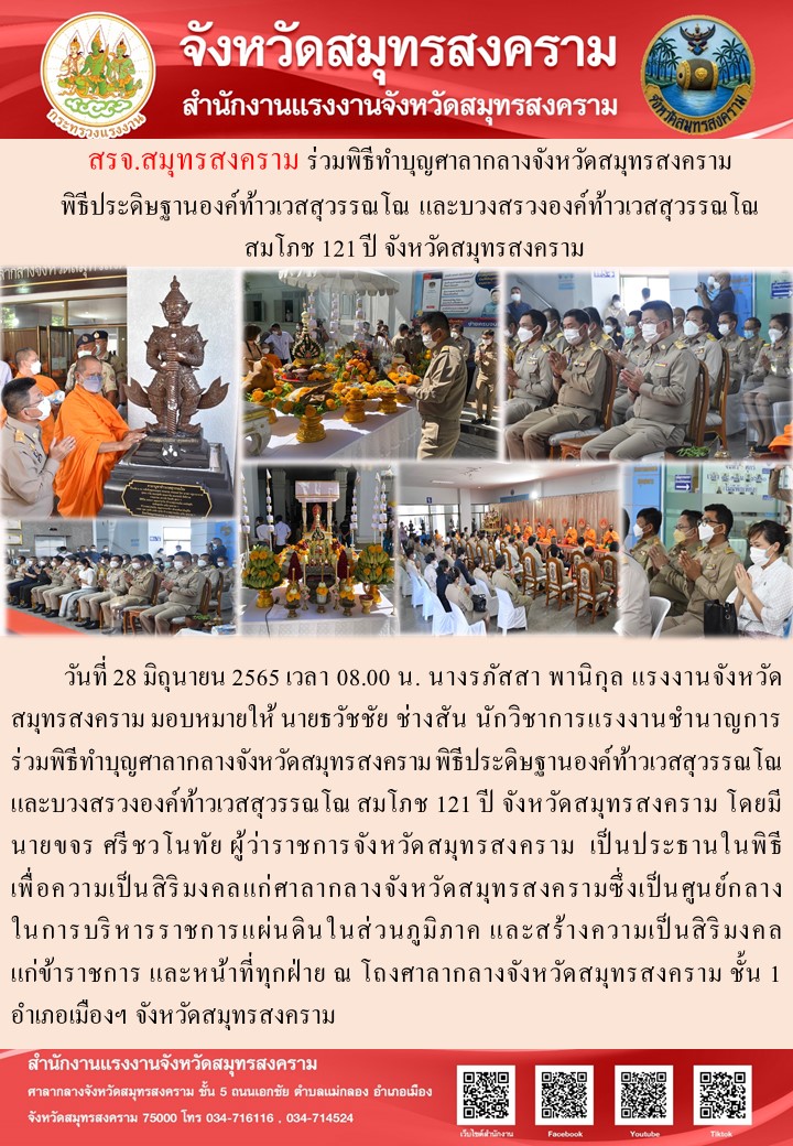 วันที่ 28 มิถุนายน 2565 เวลา 08.00 น. นางรภัสสา พานิกุล แรงงานจังหวัดสมุทรสงคราม มอบหมายให้ นายธวัชชัย ช่างสัน นักวิชาการแรงงานชำนาญการ ร่วมพิธีทำบุญศาลากลางจังหวัดสมุทรสงคราม พิธีประดิษฐานองค์ท้าวเวสสุวรรณโณ และบวงสรวงองค์ท้าวเวสสุวรรณโณ สมโภช 121 ปี จังหวัดสมุทรสงคราม โดยมี นายขจร ศรีชวโนทัย ผู้ว่าราชการจังหวัดสมุทรสงคราม เป็นประธานในพิธี เพื่อความเป็นสิริมงคลแก่ศาลากลางจังหวัดสมุทรสงครามซึ่งเป็นศูนย์กลางในการบริหารราชการแผ่นดินในส่วนภูมิภาค และสร้างความเป็นสิริมงคลแก่ข้าราชการ และหน้าที่ทุกฝ่าย ณ โถงศาลากลางจังหวัดสมุทรสงคราม ชั้น 1 อำเภอเมืองฯ จังหวัดสมุทรสงคราม
