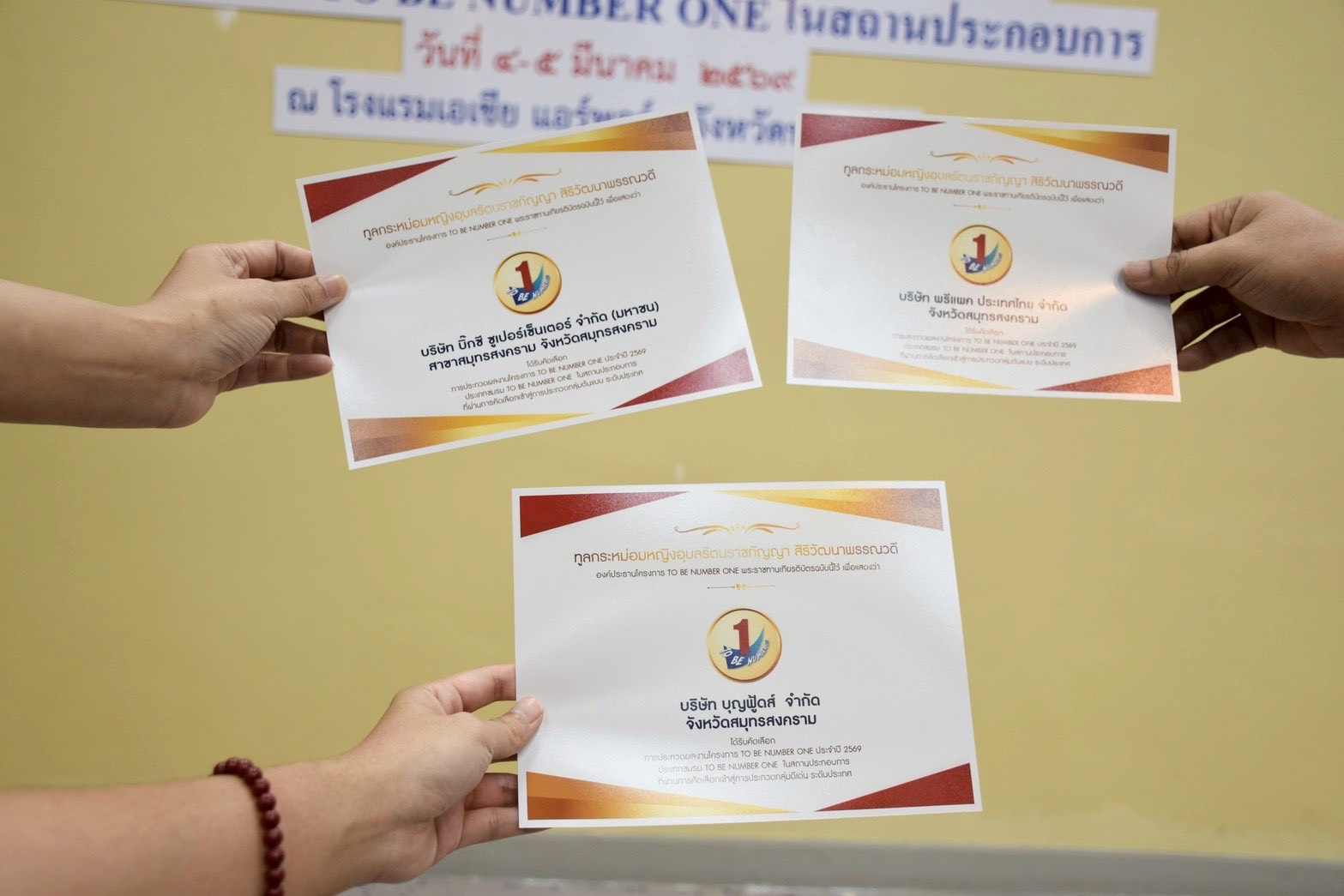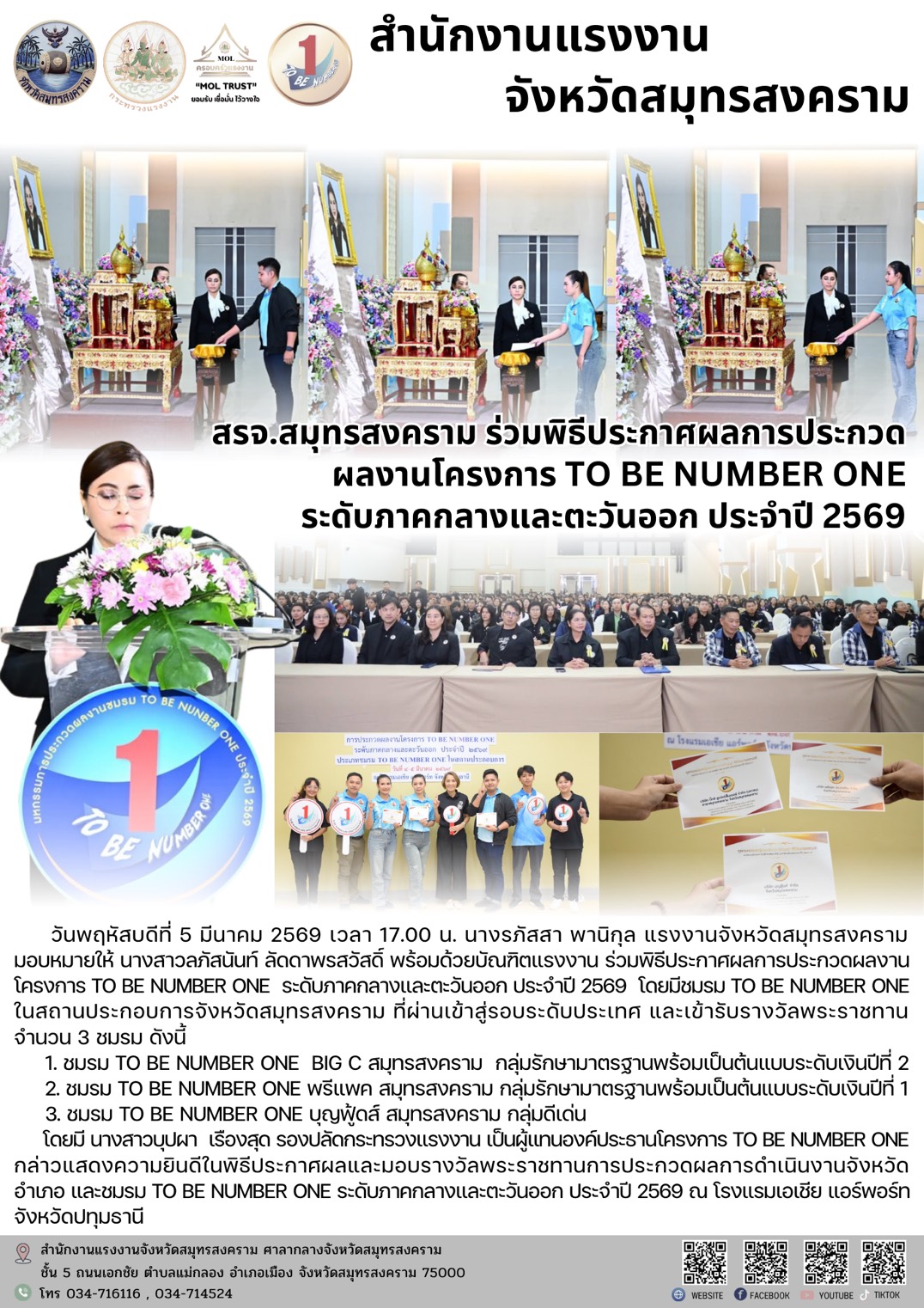 วันพฤหัสบดีที่ 5 มีนาคม 2569 เวลา 17.00 น. นางรภัสสา พานิกุล แรงงานจังหวัดสมุทรสงคราม มอบหมายให้ นางสาวลภัสนันท์ ลัดดาพรสวัสดิ์ พร้อมด้วยบัณฑิตแรงงาน ร่วมพิธีประกาศผลการประกวดผลงานโครงการ TO BE NUMBER ONE ระดับภาคกลางและตะวันออก ประจำปี 2569 โดยมีชมรม TO BE NUMBER ONE ในสถานประกอบการจังหวัดสมุทรสงคราม ที่ผ่านเข้าสู่รอบระดับประเทศ และเข้ารับรางวัลพระราชทาน จำนวน 3 ชมรม ดังนี้