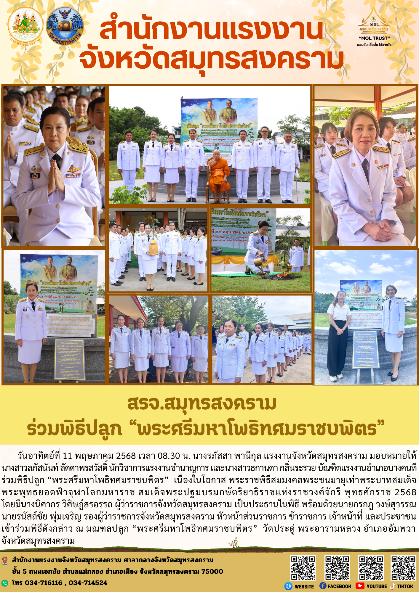 วันอาทิตย์ที่ 11 พฤษภาคม 2568 เวลา 08.30 น. นางรภัสสา พานิกุล แรงงานจังหวัดสมุทรสงคราม มอบหมายให้นางสาวลภัสนันท์ ลัดดาพรสวัสดิ์ นักวิชาการแรงงานชำนาญการ และนางสาวธกานดา กลิ่นระรวย บัณฑิตแรงงานอำเภอบางคนที ร่วมพิธีปลูก “พระศรีมหาโพธิทศมราชบพิตร” เนื่องในโอกาส พระราชพิธีสมมงคลพระชนมายุเท่าพระบาทสมเด็จพระพุทธยอดฟ้าจุฬาโลกมหาราช สมเด็จพระปฐมบรมกษัตริยาธิราชแห่งราชวงศ์จักรี พุทธศักราช 2568 โดยมีนางนิศากร วิศิษฏ์สรอรรถ ผู้ว่าราชการจังหวัดสมุทรสงคราม เป็นประธานในพิธี พร้อมด้วยนายกรกฎ วงษ์สุวรรณ นายรนัสถ์ชัย พุ่มเจริญ รองผู้ว่าราชการจังหวัดสมุทรสงคราม หัวหน้าส่วนราชการ ข้าราชการ เจ้าหน้าที่ และประชาชน เข้าร่วมพิธีดังกล่าว ณ มณฑลปลูก “พระศรีมหาโพธิทศมราชบพิตร” วัดประดู่ พระอารามหลวง อำเภออัมพวา จังหวัดสมุทรสงคราม