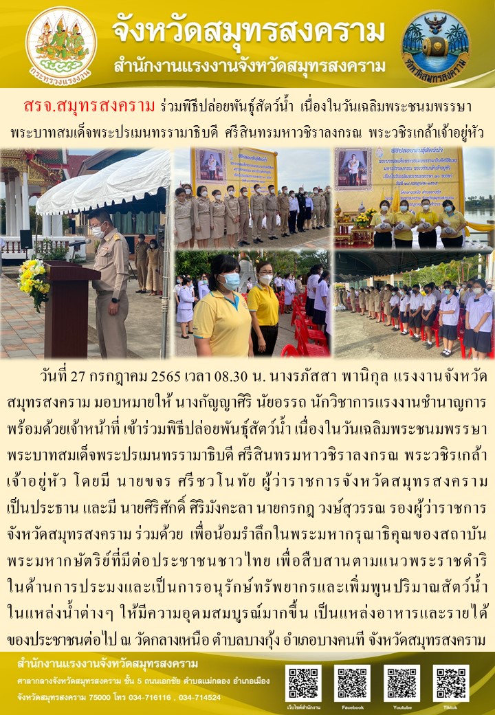 วันที่ 27 กรกฎาคม 2565 เวลา 08.30 น. นางรภัสสา พานิกุล แรงงานจังหวัดสมุทรสงคราม มอบหมายให้ นางกัญญาศิริ นัยอรรถ นักวิชาการแรงงานชำนาญการ พร้อมด้วยเจ้าหน้าที่ เข้าร่วมพิธีปล่อยพันธุ์สัตว์น้ำ เนื่องในวันเฉลิมพระชนมพรรษา พระบาทสมเด็จพระปรเมนทรรามาธิบดี ศรีสินทรมหาวชิราลงกรณ พระวชิรเกล้าเจ้าอยู่หัว โดยมี นายขจร ศรีชวโนทัย ผู้ว่าราชการจังหวัดสมุทรสงคราม เป็นประธาน และมี นายศิริศักดิ์ ศิริมังคะลา นายกรกฎ วงษ์สุวรรณ รองผู้ว่าราชการจังหวัดสมุทรสงคราม ร่วมด้วย เพื่อน้อมรำลึกในพระมหากรุณาธิคุณของสถาบันพระมหากษัตริย์ที่มีต่อประชาชนชาวไทย เพื่อสืบสานตามแนวพระราชดำริในด้านการประมงและเป็นการอนุรักษ์ทรัพยากรและเพิ่มพูนปริมาณสัตว์น้ำในแหล่งน้ำต่างๆ ให้มีความอุดมสมบูรณ์มากขึ้น เป็นแหล่งอาหารและรายได้ของประชาชนต่อไป ณ วัดกลางเหนือ ตำบลบางกุ้ง อำเภอบางคนที จังหวัดสมุทรสงคราม