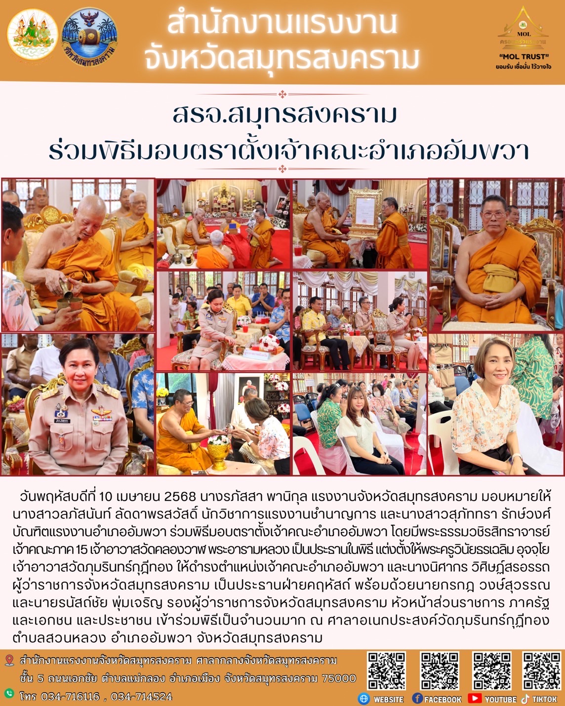 วันพฤหัสบดีที่ 10 เมษายน 2568 นางรภัสสา พานิกุล แรงงานจังหวัดสมุทรสงคราม มอบหมายให้ นางสาวลภัสนันท์ลัดดาพรสวัสดิ์ นักวิชาการแรงงานชำนาญการ และนางสาวสุภัททรา รักษ์วงศ์ บัณฑิตแรงงานอำเภออัมพวา ร่วมพิธีมอบตราตั้งเจ้าคณะอำเภออัมพวา โดยมีพระธรรมวชิรสิทธาจารย์ เจ้าคณะภาค 15 เจ้าอาวาสวัดคลองวาฬ พระอารามหลวง เป็นประธานในพิธี แต่งตั้งให้พระครูวินัยธรเฉลิม อุจจฺโย เจ้าอาวาสวัดภุมรินทร์กุฎีทอง ให้ดำรงตำแหน่งเจ้าคณะอำเภออัมพวา และนางนิศากรวิศิษฏ์สรอรรถ ผู้ว่าราชการจังหวัดสมุทรสงคราม เป็นประธานฝ่ายคฤหัสถ์ พร้อมด้วย นายกรกฏ วงษ์สุวรรณ และนายรนัสถ์ชัย พุ่มเจริญ รองผู้ว่าราชการจังหวัดสมุทรสงคราม หัวหน้าส่วนราชการ ภาครัฐ และเอกชน และประชาชน เข้าร่วมพิธีเป็นจำนวนมาก ณ ศาลาอเนกประสงค์วัดภุมรินทร์กุฏีทองตำบลสวนหลวง อำเภออัมพวา จังหวัดสมุทรสงคราม