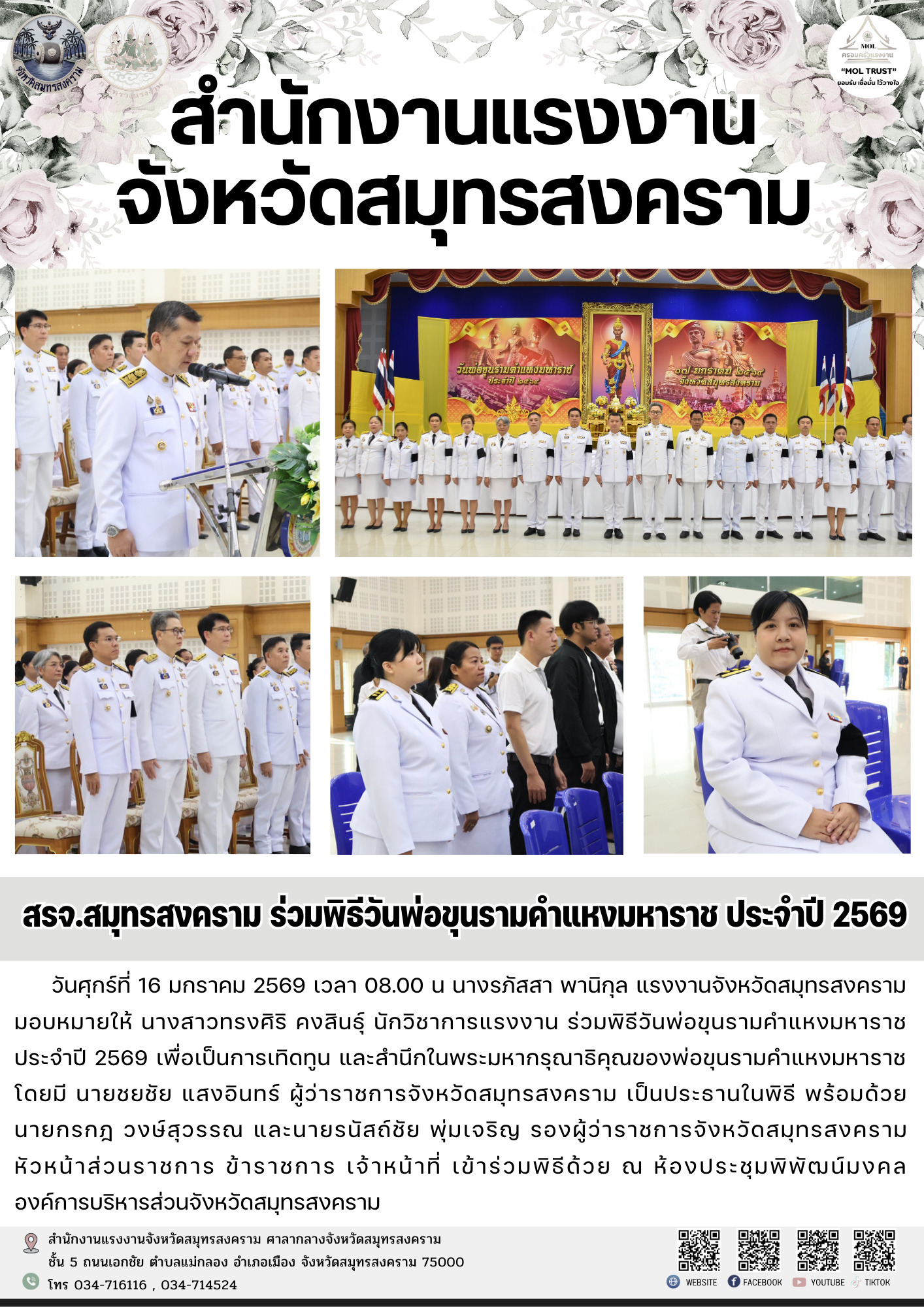 วันศุกร์ที่ 16 มกราคม 2569 เวลา 08.00 น นางรภัสสา พานิกุล แรงงานจังหวัดสมุทรสงคราม มอบหมายให้ นางสาวทรงศิริ คงสินธุ์ นักวิชาการแรงงาน ร่วมพิธีวันพ่อขุนรามคำแหงมหาราช ประจำปี 2569 เพื่อเป็นการเทิดทูน และสำนึกในพระมหากรุณาธิคุณของพ่อขุนรามคำแหงมหาราช โดยมี นายชยชัย แสงอินทร์ ผู้ว่าราชการจังหวัดสมุทรสงคราม เป็นประธานในพิธี พร้อมด้วย นายกรกฎ วงษ์สุวรรณ และนายรนัสถ์ชัย พุ่มเจริญ รองผู้ว่าราชการจังหวัดสมุทรสงคราม หัวหน้าส่วนราชการ ข้าราชการ เจ้าหน้าที่ เข้าร่วมพิธีด้วย ณ ห้องประชุมพิพัฒน์มงคล องค์การบริหารส่วนจังหวัดสมุทรสงคราม