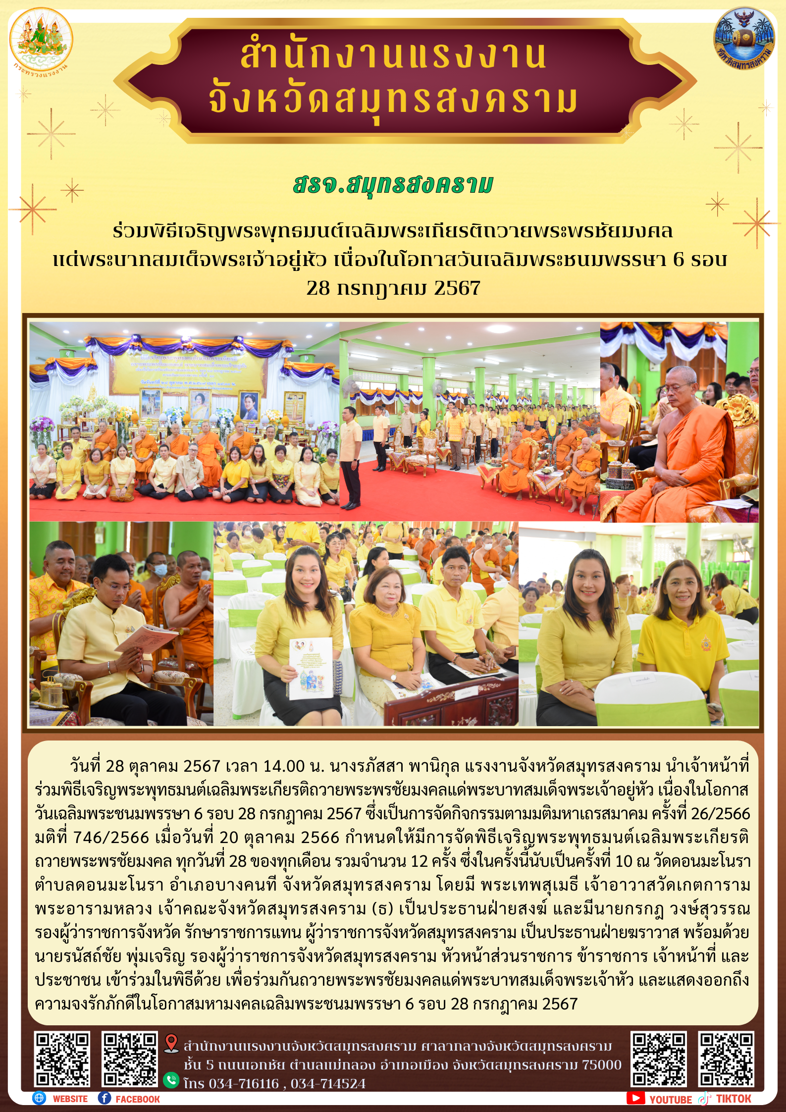 ร่วมพิธีเจริญพระพุทธมนต์เฉลิมพระเกียรติถวายพระพรชัยมงคลแด่พระบาทสมเด็จพระเจ้าอยู่หัว เนื่องในโอกาสวันเฉลิมพระชนมพรรษา 6 รอบ 28 กรกฎาคม 2567 ซึ่งเป็นการจัดกิจกรรมตามมติมหาเถรสมาคม ครั้งที่ 26/2566 มติที่ 746/2566 เมื่อวันที่ 20 ตุลาคม 2566 กำหนดให้มีการจัดพิธีเจริญพระพุทธมนต์เฉลิมพระเกียรติถวายพระพรชัยมงคล ทุกวันที่ 28 ของทุกเดือน รวมจำนวน 12 ครั้ง ซึ่งในครั้งนี้นับเป็นครั้งที่ 10 ณ วัดดอนมะโนรา ตำบลดอนมะโนรา อำเภอบางคนที จังหวัดสมุทรสงคราม โดยมี พระเทพสุเมธี เจ้าอาวาสวัดเกตการาม พระอารามหลวง เจ้าคณะจังหวัดสมุทรสงคราม (ธ) เป็นประธานฝ่ายสงฆ์ และมีนายกรกฎ วงษ์สุวรรณ รองผู้ว่าราชการจังหวัด รักษาราชการแทน ผู้ว่าราชการจังหวัดสมุทรสงคราม เป็นประธานฝ่ายฆราวาส พร้อมด้วย นายรนัสถ์ชัย พุ่มเจริญ รองผู้ว่าราชการจังหวัดสมุทรสงคราม หัวหน้าส่วนราชการ ข้าราชการ เจ้าหน้าที่ และประชาชน เข้าร่วมในพิธีด้วย เพื่อร่วมกันถวายพระพรชัยมงคลแด่พระบาทสมเด็จพระเจ้าหัว และแสดงออกถึงความจงรักภักดีในโอกาสมหามงคลเฉลิมพระชนมพรรษา 6 รอบ 28 กรกฎาคม 2567