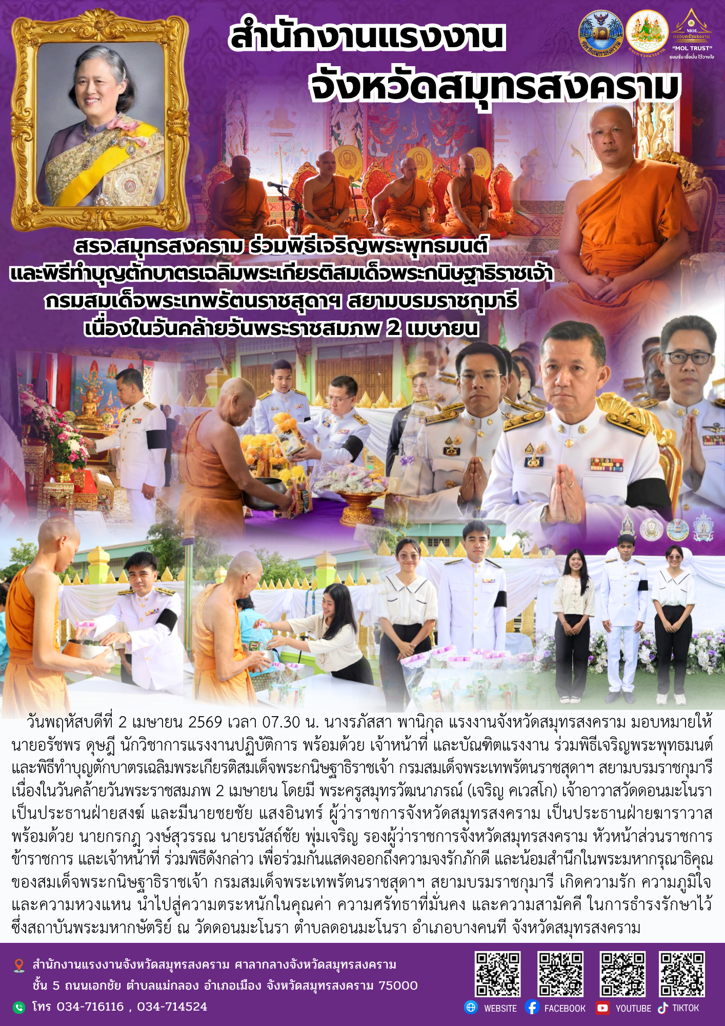 วันพฤหัสบดีที่ 2 เมษายน 2569 เวลา 07.30 น. นางรภัสสา พานิกุล แรงงานจังหวัดสมุทรสงคราม มอบหมายให้