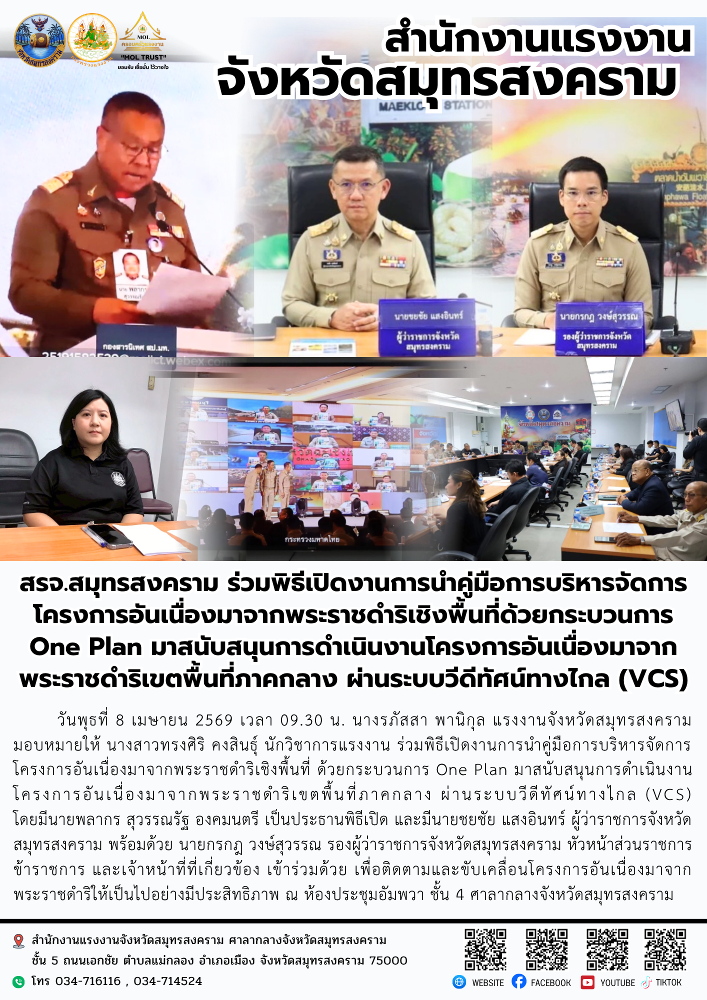วันพุธที่ 8 เมษายน 2569 เวลา 09.30 น. นางรภัสสา พานิกุล แรงงานจังหวัดสมุทรสงคราม